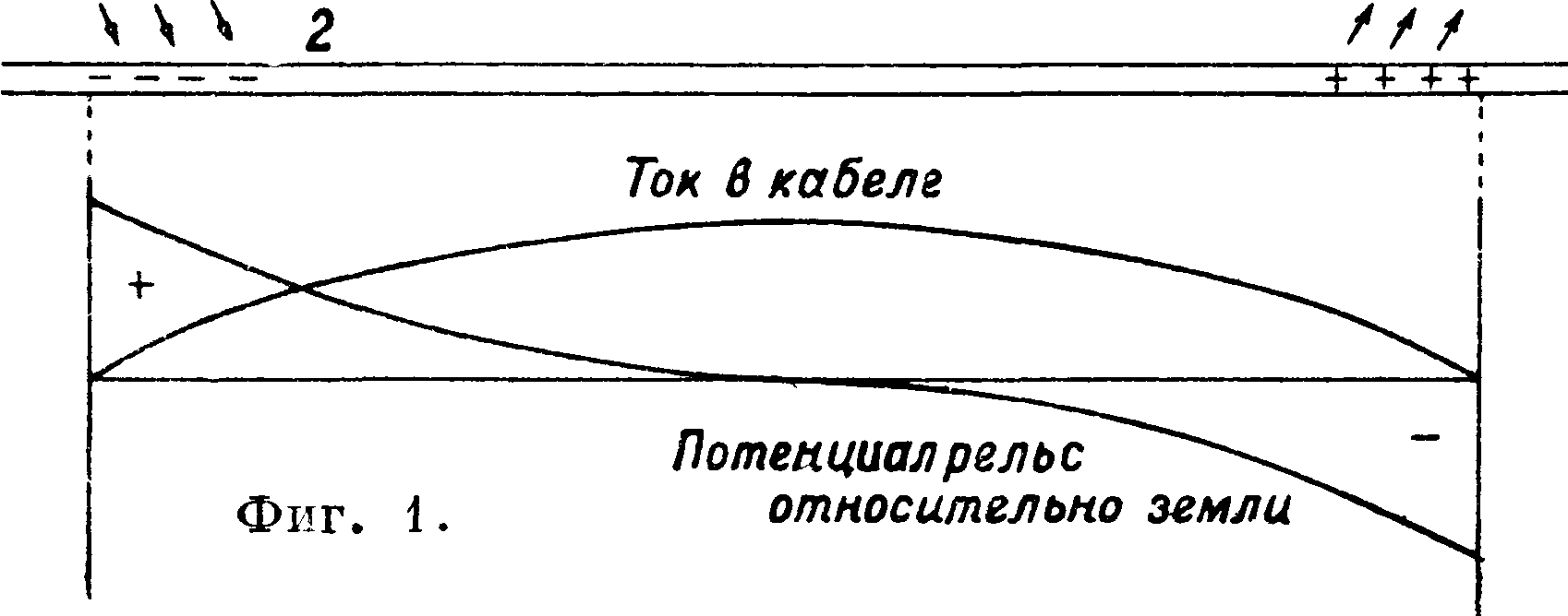 хода тока из подземных сооружений устраивается элект-рич. соединение с отрицательной шиной подстанции 2 или с рельсами; Т. б. при этом как бы отсасываются подстанцией, и утечка их в грунт уменьшается. Эта мера во многих случаях оказалась вполне действительной. Необходимо лишь подобрать сопротивление дренирующего проводника (дренажа) т. о., чтобы Т. б. в трубе не слишком возросли и чтобы потенциал защищаемого сооружения во всех местах был ниже потенциала окружающего грунта. Лучше всего включить на подстанциях последовательно с дренирующим проводом регулируемое сопротивление, а также амперметр для постоянного контроля над Т. б. 13) Отсасывающие электроды представляют собой металлич. пластины (лучше всего цинковые), закладываемые глубоко в землю с целью создать малое переходное сопротивление. Пластины соединяют изолированным проводом с оболочками кабелей или с трубами. При размещении отсасывающих электродов необходимо тщательно следить за тем, чтобы потенциал окружающего их грунта был всегда ниже потенциала защищаемых сооружений, в противном случае электроды будут приносить вместо пользы вред, давая возможностьТ б. легко попасть в кабели и трубы. 14) В нек-рых случаях не без успеха в качестве защитной меры использовались металлич. пластины и полосы (металлич. экраны), располагавшиеся между токонесущими рельсами и угрожаемыми подземными трубами и кабелями. Такие экраны воспринимали насебя бблыную часть Т.б. и предохраняли подземные сооружения от электролитич. коррозии. 15) На нек-рых англ, электрич. ж. д., питаемых третьим рельсом, возврат тока от подвижного состава совершается не через ходовые рельсы, а при помощи «четвертого» изолированного от земли рельса. Такая система питания обычно дает вполне надежную гарантью от возможности появления блуждающих токов, однако вследствие сложности и высокой стоимости рельсовых цепей она в настоящее время применяется редко.