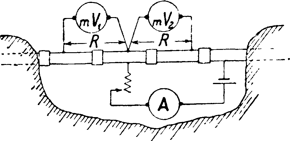 Труба или кабель раскапывается на участке в 5—10 метров и к ним приключается батарея аккумуляторов. Замеряй фиг. е. силу тока в питающем проводе и падение напряжения (милливольтметром, 0—15 mV) на равных участках трубы, вычисляют сопротивление R по ф-ле: