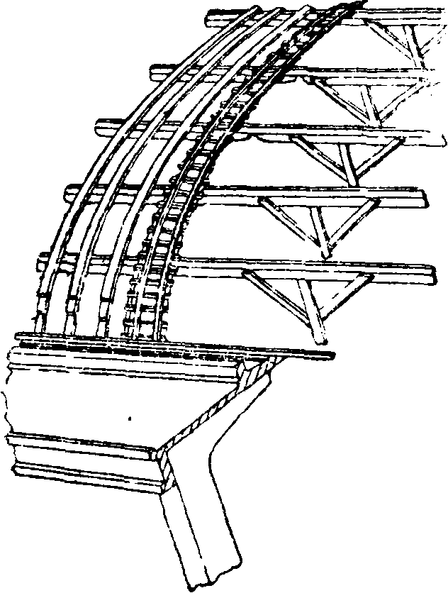 шарнирно с целью осуществления подвижности сводов вследствие изменения длины под влиянием t° (фигура 7 и 8). В виду новизны дела и необычной величины пролетов строительное об-во Дикергоф и Видман, задумавшее осуществление этого сооружения, произвело предварительно постройку пробной модели в 1/3натуральной величины (фигура 9), имевшей толщину свода в 2,7 см. Модель подверглась испы