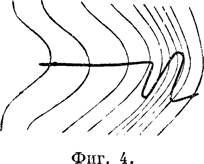 С л у ч а и 2. На карте дано два обязательных пункта прохода трассы А и В (фигура 6). От обоих пунктов наносят на план две линии нулевых работ до пересечения их в точке С. Искомой линией будет линия ДОН. Полученная по плану в горизонталях линия нулевых работ— обычно довольно извилиста и имеет большое число фиг* 6· резких поворотов.