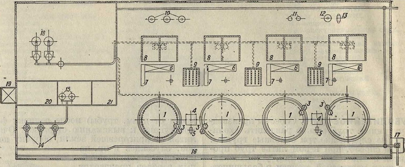 машинами, 1—карусель, 2—опока, 3—набивная машина, 4—машина для приготовления формовочной земли, 5—элеватор, 6—тележка для стержней, 7—станок для обточки стержней, 8—сушилка для стержней, 9—сушилка для колец, 10—глиномеска, 11—машина для чугунные шары (числом 54, 0 2"). Эта часть карусели неподвижна. На выступы нижнего конуса надевается второй подвижной конус, к которому прикреплен склепанный из балок кожух. Кожух этот расположен на уровне пола мастерской и несет башмаки соответствен-