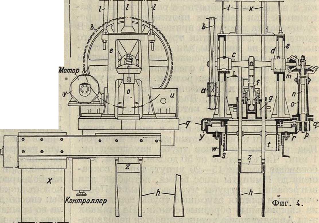 Набивочные машины системы Ардельта чрезвычайно интересны как по идее, так и по производительности (фигура 4). На фигуре: а—малое ведущее цилиндрич. зубчатое колесо, насаженное на вал мотора, b—ведомое цилиндрич. зубчатое колесо, с—вал с эксцентриком, d— подшипники с кольцевой смазкой, е—стойки, f—эксцентриковая штанга с шаровой головкой, д—муфта с зажимами для штанг, h— трамбовки, г—верхнее соединение трамбовочных штанг, к—штанги для трамбовки, I—конструкция каркасного типа с направляющими для штанг, т—конич. зубчатая передача, п— вертикальный вал, о—колонка с опорными подшипниками, р—цилиндрич. зубчатое колесо, q—верхняя плита, г—нижняя плита, s—контактные кольца, ί—барабан для контактных колец, и—направляющая нижняя (противовес), ν—направляющая (место для установки электромотора), w—укосина из швеллерного железа, х—колонна, у—шариковая опора, z—кольцо для укрепления трамбовок. Вращательное движение машина получает от электромотора. Посредством цилиндрич. зубчатой передачи приводится во вращение вал с опорами для которого служат две стойки е с подшипниками. На вал с насажен эксцентрик со штангой f, посредством которого штанги трамбовки получают возвратно-поступательное движение. На конце вала с имеется кроме того конич. зубчатая передача для сообщения вращательного движения вертикальному валу п. На конце последнего, ниже плиты q, насажено цилиндрич. зубчатое колесо, находящееся в зацеплении с зубчатым колесом, составляющим одно целое с нижней плитой. Кольцо z подвешено на штангах к и служит для укрепления на нем отдельных трамбовок h. Указанные штанги посредством особой крестовины соединены между собою. Направлением для штанг служат внизу особые устройства в виде коробок и и ν, из которых первая (и) используется как противовес, а вторая (ν)— для установки электромотора. В крестовине, соединенной со штангой эксцентрика, имеются зажимы для трамбовочных штанг. Эти зажимы сконструированы т. о., что штанги м. б. смещены в зажимах только при усилии, обусловленном сопротивлением уплотненной трамбовками формовочной земли. При наступлении этого момента трамбовочные штанги продвигаются несколько в зажимах, причем последние снова автоматически захватывают штанги при движении их в обратном направлении. Вверху трамбовочные штанги имеют также направляющие в виде стоек, связанных между собой и укрепленных растяжками к стойкам е. Вращение всей машины относительно оси, а. вместе с тем и трамбовок обусловливает достижение необходимой равномерности набивки формы, так как при каждом ударе утрамбовывается одинаковое количество земли. Для подвода тока к мотору служат контактные кольца, s. Опорой машины служат два швеллера, укрепленные на колонке х. Набивочная машина, делает от 150 до 200 ударов в мин., расходуя до 2,5 1Р. Производительность машины очень значительна. Для того чтобы набить опоку 3"