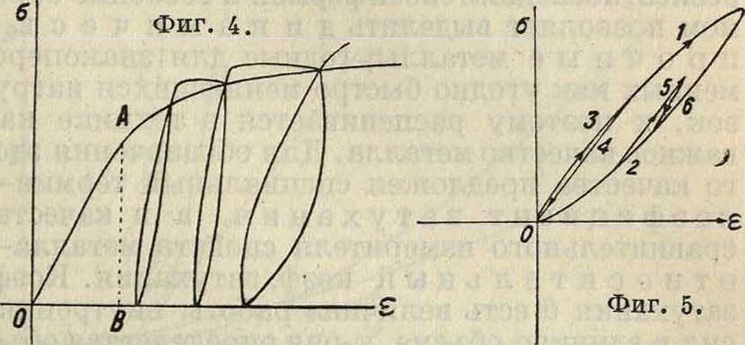 ходя через две призмы, падает на призму е, свободно насаженную на стержень динамометра, но связанную с головкой b и вибрирующую вместе с последней. От призмы е световой луч попадает через систему призм на матовый экран д и проходит на нем путь, составляющий диаграмму напряжение—деформация в течение каждой смены нагрузки образца, то есть при каждом обороте машины. Кривую гистере ласти (фигура 4). Петля гистерезиса обнаружена при переменной нагрузке (от 0 до σ) и знакопеременной нагрузке (от —σ до +σ) и в условиях как статического,так и динамич. действия нагрузки. Полуоси петли гистерезиса и объём ее (площадь) имеют различную величину для разных металлов и изменяются для одного и того же металла под действием особых факторов—истории металла (числа циклов предварительной нагрузки), высоты наибольшего напряжения в цикле, ί°, формы и размеров образца, вида деформации, а также термич. и холодной обработки. Фигура 5 изображает изменение петли от высоты напряжения. От скорости деформации появление петли и размеры ее повидимому не зависят; также и от продолжительности действия нагрузки. Нек-рые хрупкие металлы обладают гистерезисом (например чугун); вязкие металлы с удлинением при статич. разрыве не менее 5,5% всегда показывают петлю того или иного размера.