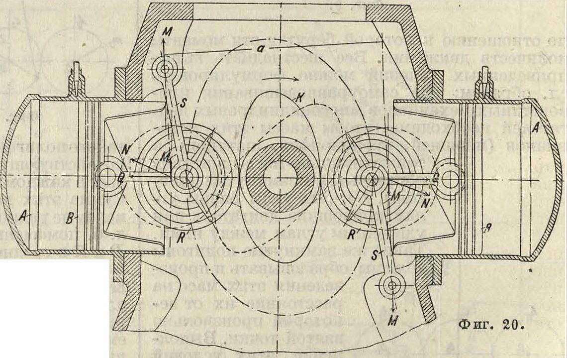 могут возникать под влиянием пар сил Рb (фигура 1). Как было установлено эксперимен тальным путем, эти вибрации могут явиться причиною значительных потерь в мощности двигателя, доходящих до 10 и более %. Для устранения этих вибраций существует способ выравнивания вращательных моментов и их реакций в поршневых двигателях. Сущность этого способа состоит в следующем. В центральной части коленчатого вала двигателя между двумя средними коренными подшипниками устанавливается кулачковый диск К (фигура 20) с количеством кулаков, равным количеству цилиндров для двухтактных двигателей и половине этого количества для четырехтактных двигателей. Назначение этих кулаков—приводить в движение поршни В буферных цилиндров А, в которых при этом попеременно сжимается и расширяется заключенный в них воздух.