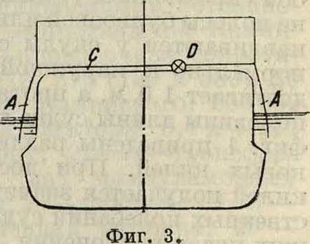 Из ур-ия (5) видно, что при к2=п2, то есть при равенстве периодов волны и воды в цистерне, и при h=0 вынужденные колебания исчезают. Но кфО, поэтому при к2=п2 амплитуда вынужденных колебаний весьма мала. Это явление в общей теории колебания двойного маятника известно под именем двойного резонанса. При этом фаза колебаний воды в цистерне отстает от фазы колебаний волн на 180°, то есть действие воды в цистерне на судно противоположно действию волн. Фрам при расчете и конструировании цистерны принял, что период собственных колебаний судна равен периоду колебаний воды в цистерне (к2 — т2), т. к. явление резонанса при качке, а следовательно наибольшие колебания судна будут при совпадении периодов судна и волны, то есть при равенстве периодов колебания воды в цистерне и волны (к2=п2), иначе говоря, при двойном резонансе. Как опыт показал, в этом случае при действии цистерн происходит наиболее энергичное умерение качки. При 1с2=т2 происходит также умерение качки, но менее энергичное. В последнее время применяются цистерны с зным сообщением (.фигура 3), в которых роль соединительного водяного канала играет зная вода. Соединение цистерн с зной водой производится помощью кингстонов, сечение которых определяется надлежащим путем. Отметим, что для умерения качки впервые воду в открытой цистерне применил Ф. Уатте.