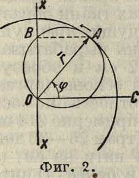 2 л момент t будет определяться равенством (7), то есть углом НОС. Вместо точки А, движущейся по окружности, можно представить себе, что радиус-вектор г= О А вращается равномерно около своего начала О и проектируется на неподвижную прямую хх. Угол, образованный прямой ОС, перпендикулярной к прямой хх, и данным положением радиуса-вектора, и будет представлять собой Ф. в момент f. Вместо радиуса-вектора г можно взять также окружность с диаметром АО (фигура 2), которая очевидно