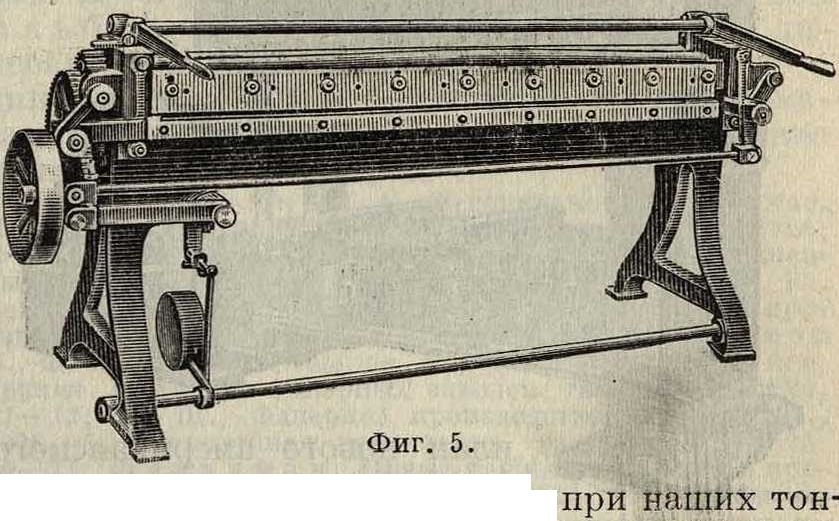 токарного станка с поперечным самоходным супортом.на к-ром укреплен лущильный нож. В зависимости от диаметра чурака и толщины снимаемой фанеры получается лента длиною в 20 ж и более. Обычно имеются две скорости подачи: одна для предварительной обдирки чураков, а другая для чистой работы по лущению, причем перемена скоростей производится без остановки станка. 5) Полученные ленты направляются к ножницам (фигура 5),