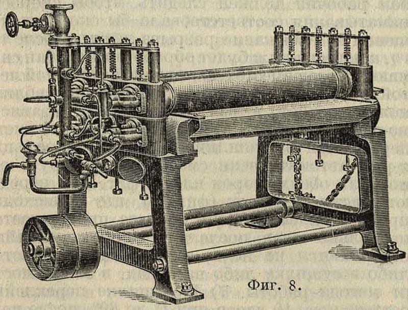 Фигура з. зами бревна очищают предварительно от коры. Фрезы (фигура 3) устраивают в виде тонких дисков а, снимающих одну только кору узкими полосами и не захватывающих древесину, для этого на валу фрезы укреплен нож б, который прокалывает кору, но задерживается более твердой древесиной и определяет т. о. глубину врезания фрезы. Кряж в вращается по направлению стрелки. 2) После очистки кряжи распиливаются на кругляки (ч у р а к и) определенной длины (от 1 до 2 м) либо на обыкновенных круглопильных станках (смотрите Деревообделочные станки) либо специальными паровыми пилами. Паровой пильный станок состоит из длинного узкого парового цилиндра, помещенного на легкой железной или чугунной раме. Цилиндр качается на двух цапфах в вертикальной плоскости. Длинными крючьями, вгоняемыми в бревно, станок удерживается во время работы в требуемом положении. Шток поршня непосредственно соединен с пилой, которая получает от него переменновозвратное поступательное движение. 3) Следующая важная операция — варка или пропарка. Распиленные кряжи на вагонетках доставляют в парильню, где их пропаривают отработанным паром или проваривают в горячей воде, все время подогреваемой змеевиковой паровой трубой. Качество фанеры при варке несравненно лучше, чем при пропарке, в особенности это относится к ценным породам, где изменение цвета древесины влечет за собой брак фанеры. Продолжительность варки (12—36 час.), затруднительность операций при загрузке и выгрузке являются отрицательными сторонами этого способа работы. В последнее время начали заменять деревянные чаны для варки кряжей более усовершенствованными бетонными. Парильня обычно представляет собой одноэтажное здание, устроенное таким гбразом, чтобы потери тепла были незначительны. Парильные котлы делаются из чугунных секций, имеющих довольно толстые стенки; хотя стоимость их весьма высока, все же они применяются значительно чаще, чем более дешевые железные, т. к. последние быстро разъедаются выделяющимися из древесины к-тами. Железными котлами можно пользоваться только при небольшом давлении до 2 atm и быстрой пропарке в 3—4 часа, когда дерево еще не успевает разложиться. 4) Пропаренные чураки передаются на лущильный станок (фигура 4), представляющий собой род