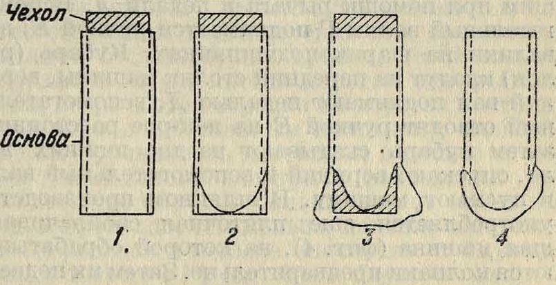Процесс ручной закладки и затем следующая за ним катка для фетровой обуви совершенно одинаковы с таковыми для обыкновенной валяной обуви (смотрите Войлочное производство). Обработка же заложенной механическим способом основы несколько иная. С конуса снимается в обувном деле не колпак, открытый только с одного конца, как это имеет место в шляпном производстве, а колпак, открытый с двух концов и надетый на холстовый чехол. Это делается для того, чтобы в дальнейшем во время катки стенки колпака не сращивались. Поэтому ему необходимо еще придать форму ноги, то есть образовать носок и пятку, после чего он будет напоминать сапог. На фигуре 2 показано образование головки основываленка механич. закладки способом оттяжки после затростки носка: 1—основа на чехле, снятая с конусного аппараг та, 2—на основе сделан надрез, 3—по надрезу сделан разрыв основы, 4—чехол вынут—основа подготовлена к затростке носка, б—носок за-трощен, 6—затрощенный носок выкатан, 7, 8— две стадии оттягиваемого носка. Катка основы в настоящее время в фетровом производстве делается механически на катальных машинах.