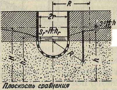 пользуясь которым можно определить коэф. Ф. к, причем величины г и h м. б. определены непосредственным измерением, а величина Q выявлена пробной откачкой. Для нахождения величины z загоняют в грунт в расстоянии х от центра колодца наблюдательную трубу, при помощи которой м. б. определено понижение s уровня воды в расстоянии х от центра колодца при пробной откачке воды из него. Зная s, можно определить z=Н — s. Все измерения величин h и z должен быть произведены после откачки воды из колодца в продолжение нескольких дней, когда Ф. воды через поры грунта по направлению к колодцу станет б. или м. постоянной.