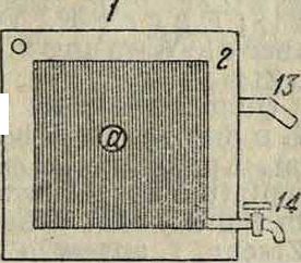 которых задняя 5—неподвижна, а передняя 6 при помощи винта 7, упирающегося с одной стороны в гнездо 8, а с другой имеющего маховичок 9, может передвигаться взад и вперед (в больших фильтр-прессах вместо маховичка и винта для передвижения плиты и стягивания пресса применяется гидравлич. пресс или компрессор). Плиты камерного фильтр-пресса имеют посредине отверстие а; при стягивании плит эти отверстия образуют центральный канал 10, в к-рый при помощи насоса подается фильтруемая масса, распределяющаяся затем по отдельным фильтровальным камерам. Фильтрующим материалом служит хл.-бум. или другая ткань (салфетки); ткань 11 сшивается в виде