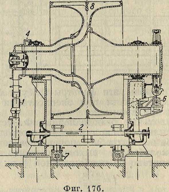Ф. системы Вольфа (фигура 17а, 176). Вакуум-фильтр машиностроительного завода Р. Вольф в Магдебурге (Германия) состоит из корыта 1 с механич. мешй 2 ff ^С. (или без нее), фильтрующего барабана 3 с подшипниками, распределительной головкой 4, стального скре-