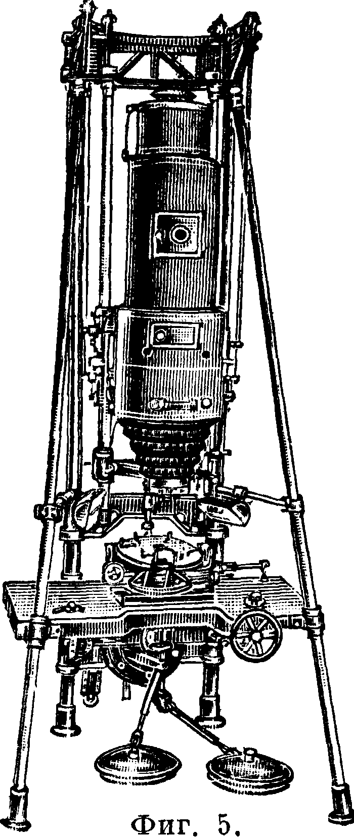 Соколова позволяет восстанавливать существо^ вавший в момент съемки проектирующий пучок лучей и пересечь его плоскостью экрана Е. Для трансформирования в разных масштабах прибор должен иметь набор объективов с разными фокусными расстояниями. Вертикальный Ф. сист. Соколова отличается от описанного лишь конструктивным оформлением. Весь Ф. смонтирован на металлич. вертикальных штангах, несущих посредством особого скрепления проекционный фонарь, кассету и объектив (фигура 5). Экран установлен на особом столике. Управление Ф. может производиться при посредстве ручного управления или ножных педалей, расположенных внизу под прибором. Вертикальный Ф. сист. Соколова является прибором более усовершенствованным и удобным при работе по сравнению с горизонтальным.