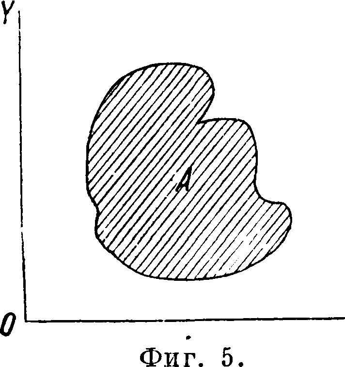 Ф. от многих переменных. Если каждой паре значений х и у соответствует по какому-нибудь закону значение и, то и называют Ф. от независимых переменных х и у. То же относится и к большему числу независимых переменных. При непрерывно изменяющейся паре аргументов точка (ж, у) может быть выбрана где угодно внутри определенной о б л а с-т и А плоскости XOY (аналогично интервалу для одной независимой переменной). Область А может состоять из части плоскости, ограниченной единственной замкнутой кривой (односвязная область, фигура 5); область А м. б. ограничена несколькими замкнутыми кривыми (многосвязная область). Число ограничивающих кривых определяет «число связности». На фигуре 6 дана трехсвязная область. Геометрически Ф. от двух переменных можно представить с помощью поверхностей, рассматривая пространственную систему координат ж, у и и. Другое геометрии, изображение хо-,х да Ф. достигается с помощью линий уровня (линий равных высот, линий равных глубин ит.д.). На фигуре 7 приведены линии уровня функции и= х2 + у2. См. также Эллиптические функции, Шаровые функции.