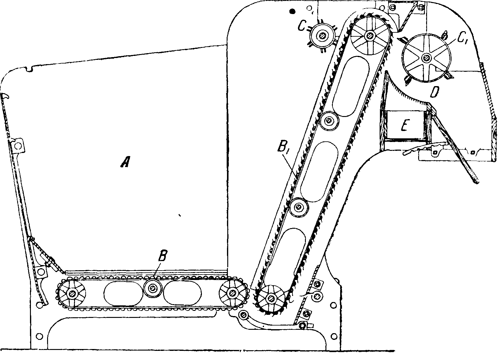 с нее барабанчиком С сбрасывается излишек, и т. о. между зубьями барабанчика и иглами проходит определенная толщина хлопка в зависимости от разводки, то есть расстояния между зубьями барабанчика С и иглами решетки. Далее с зубьев решетки хлопок сбрасывается следующим барабанчиком Сх) и направляется в опенер, причем выделяющиеся более крупные примеси через решетку!) проваливаются в ящик Е.
