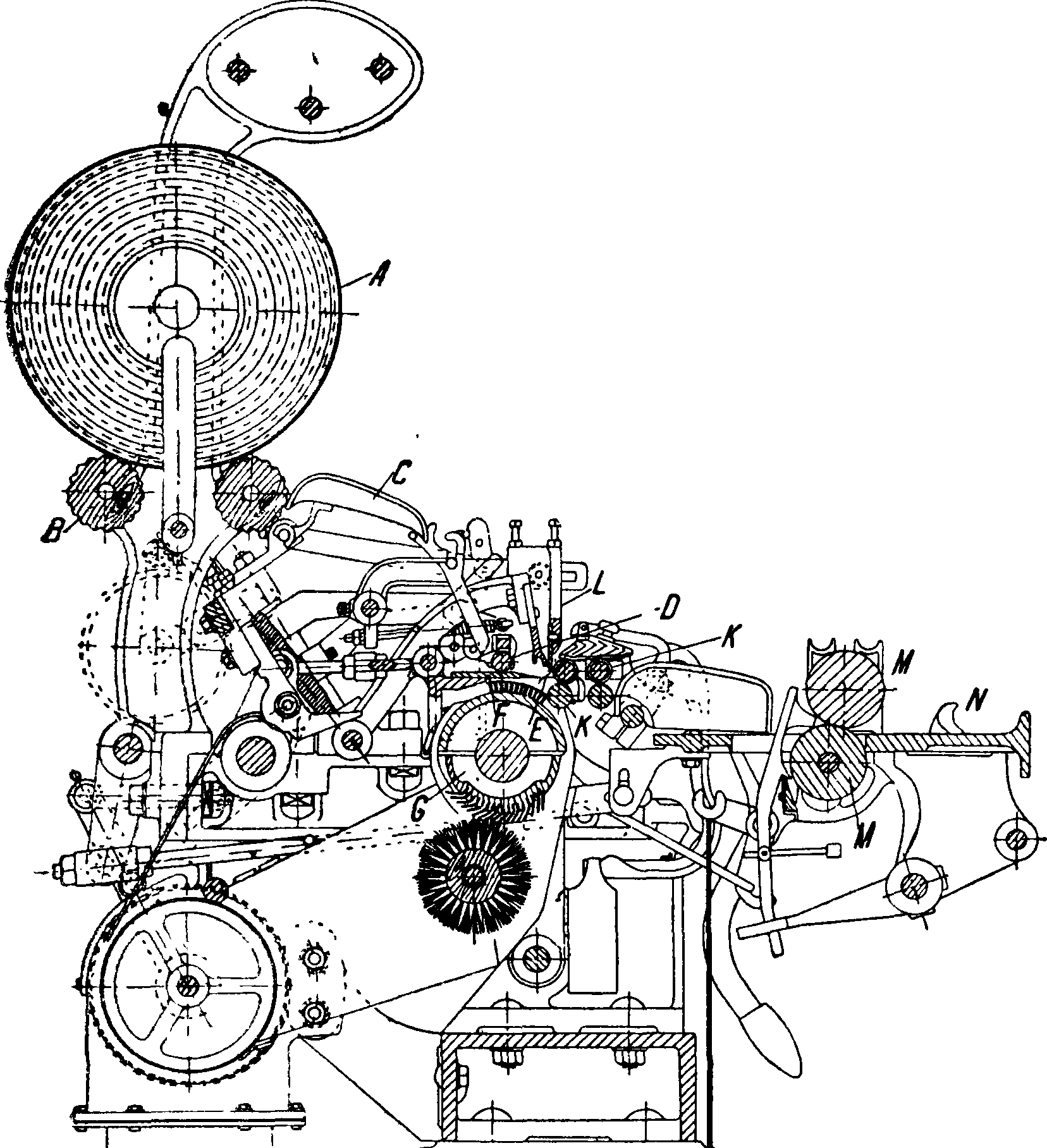 кардочесания примесей. Но так как та часть хлопка, которая была зажата во врем^ прочеса тисками, а также близкая к ним, прочесыванию гребней не подвергалась, то для прочесывания ее имеется падающий гребень L, который опускается в бородку хлопка после того, как тиски раскроются и когда отделительный валик К опустится на рифленую часть J гребенного барабанчика G; до этого же отделительные валики Н обратным вращением подают прочесанную за предыдущий период мычку хлопка обратно для соединения ее при помощи валика К с только что прочесанной. Отделительные валики Н получают затем движение вперед и продвигают непро-чесанную мычку через опущенный гребень. После этого тиски закрываются, гребень поднимается, и валик К занимает прежнее свое положение; т. к. до этого произошла подача холстика к тискам, как описано выше, то начинается второй цикл работы, то есть бородка хлопка, зажатая тисками, прочесывается 17 рядами гребней барабанчика и т. д. Прочесанный хлопок в виде мычки продвигается к плющильным валикам ММ, откуда в виде ленты выпускается и у N поворачивается почти под прямым углом и по гладкому полированному столику продвигается вместе с другими такими же лентами к вытяжному аппарату, состоящему из трех вытяжных пар, где обыкновенно происходит сложение лент (6—8, смотря по тому, сколько голсвок на гребнечесальной машине). Гребенная машина системы Гейльмана в общем является очень сложной.