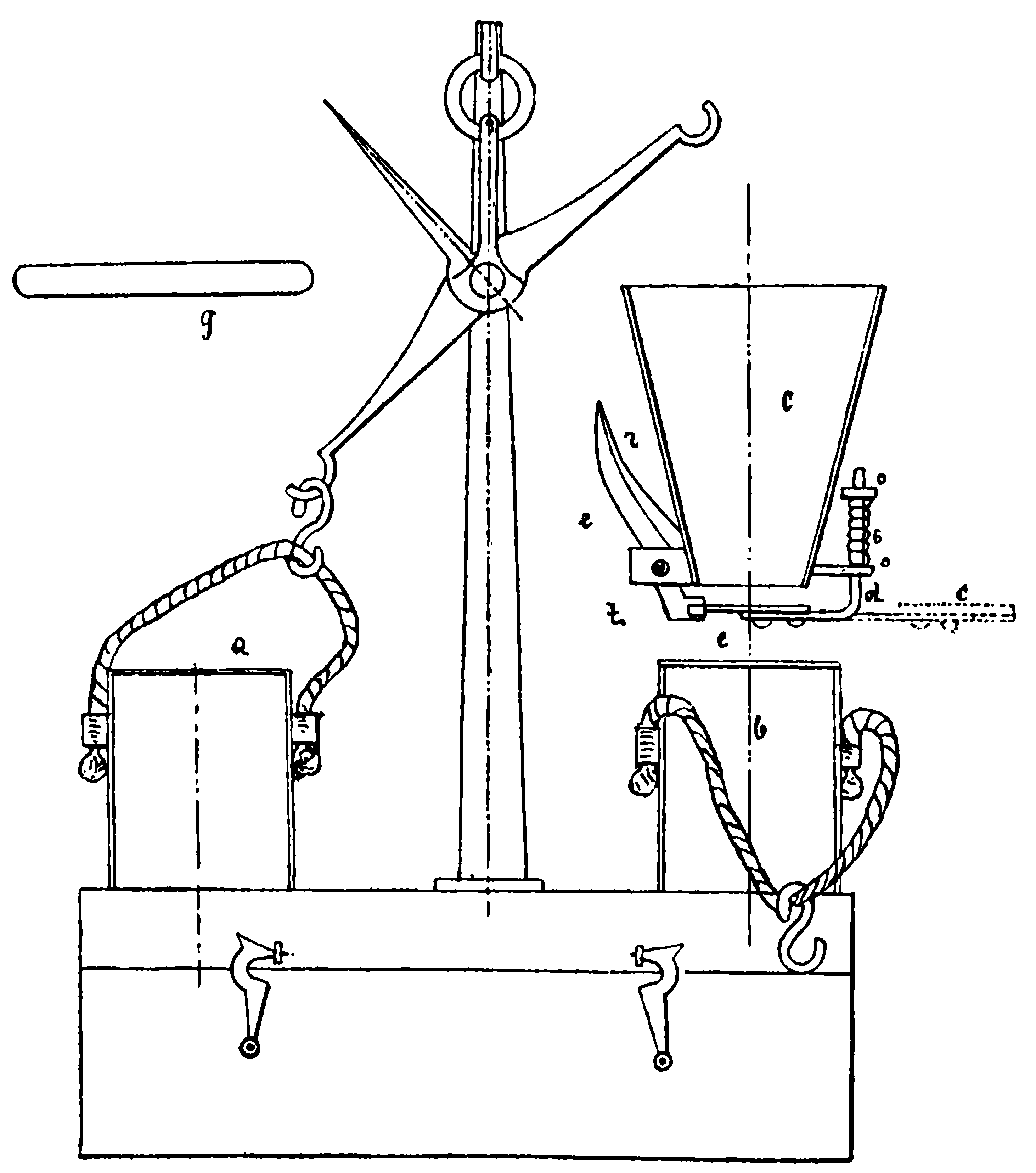Натура зерна есть вес единицы его объёма, например четверти в пудах и фунтах. Натура зерна определяется помощью особых аппаратов, называемых пурками. Систем пурок очень много; мы опишем самую простую из них и наиболее распространенную — гамбургскую пурку, представленную на рисунке 279. Зерно ссыпается в воронку с помещаемую над стаканом b. Когда воронка наполнена зерном, ее помещают на определенной высоте (около 2,5 см) над стаканом b (стакан b на рисунке показан перевернутым вверх дном), помощью рычажка откидывают подвижное дно воронки, и зерно ссыпается в стакан b. Излишек зерна из стакана b снимают гребом, и стакан с зерном взвешивают. Вес выражается в золотниках; этот вес и обозначает натуру, например: „рожь натурой в 120 золотников“. Для определения веса четверти золотники умножают на 3 и делят на 40, получая вес четверти в пудах,— в нашем случае (120×3)/40=9 пудов.