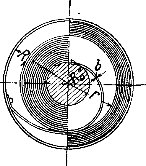 Что касается геометрия, размеров пружины, гл. обр. ее толщины b и длины L (т. к. ширина повлияет только на высоту барабана), то здесь должен быть соблюдены два условия. Первое из них формулируется так: толщина пружины в барабане должен быть не больше х/зо диаметра 2R0 валика (фигура 5), т. н. федеркерн а. Это условие продиктовано соображениями прочности клинка пружины для того, чтобы при наматывании на валик при заводе у внутренних витков не получалось опасных перенапряжений во внешних волокнах пружины. Второе условие: чтобы барабан дал наибольшее возможное число оборотов после полного завода, необходимо, чтобы пружина занимала ровно половину свободного пространства внутри барабана, то есть чтобы внутренний радиус спущенной пружины равнялся внешнему радиусу заведенной пружины. Если обозначить радиус внутренней стенки барабана через Rl9радиус валика через R0 и внутренний радиус спущенной пружины, равный внешнему радиусу заведенной пружины, через г, то