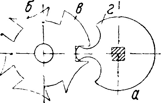 В хороших Ч. на барабане ставят остано-в ы, наиболее распространенный тип к-рых, т. н. мальтийский крест, дан на фигуре 8. Этот механизм служит для ограничения числа оборотов валика по отношению к барабану. Диск а с пальцем насаживается на квадрат валика, а звездочка б укрепляется свободно на дне барабана. При вращении палец диска а входит по очереди во все впадины звездочки до тех пор, пока выпуклое крылышко в не упрется в боковой выступ г диска с пальцем. Дальнейшее движение невозможно. Остановом можно ограничить кривую моментов, используя лишь ее прямую часть и одновременно предохраняя пружину от обрыва при форсированном заводе.