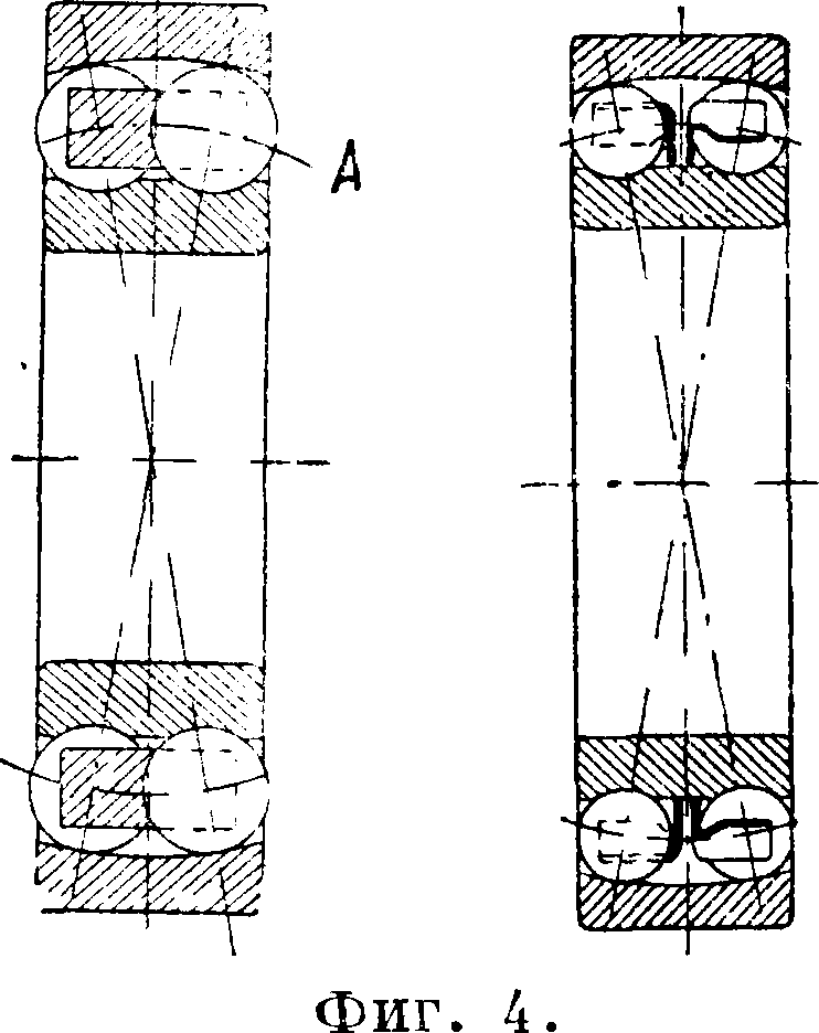 4) Шарикоподшипники радиальные самоустанав-ливающиеся (фигура 4) имеют в наружном кольце сферич. поверхность катания, чем обеспечивается соприкосновение шариков с наружным Фпг. з. К0ЛЬц0М в случаях, когда оси на. ружного и внутреннего колец не совпадают друг с другом, благодаря чему эти шарикоподшипники широко применяются, когда существует опасность несовпадения осей вала и корпуса, куда закладывается шарикоподшипник. Как правило шарикоподшипники само-устанавливающиеся не следует подвергать аксиальной нагрузке. Шарикоподшипники этого рода разделяются на: а) серии нормальной ширины (фигура 4, А) —легкую, среднюю, тяжелую