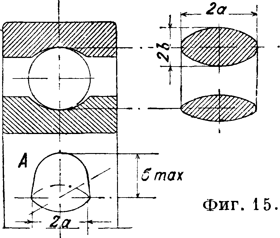 Иначе говоря, максимальная нагрузка на один шарик равна всей нагрузке подшипника, отнесенной к одной пятой всех шариков. Ур-ие Герца дает соотношение между напряжением, максимальной нагрузкой на один шарик и величиной площади соприкосновения (фигура 15) между шариком и беговой дорожкой, представляющей собой эллипс с полуосями а и b: