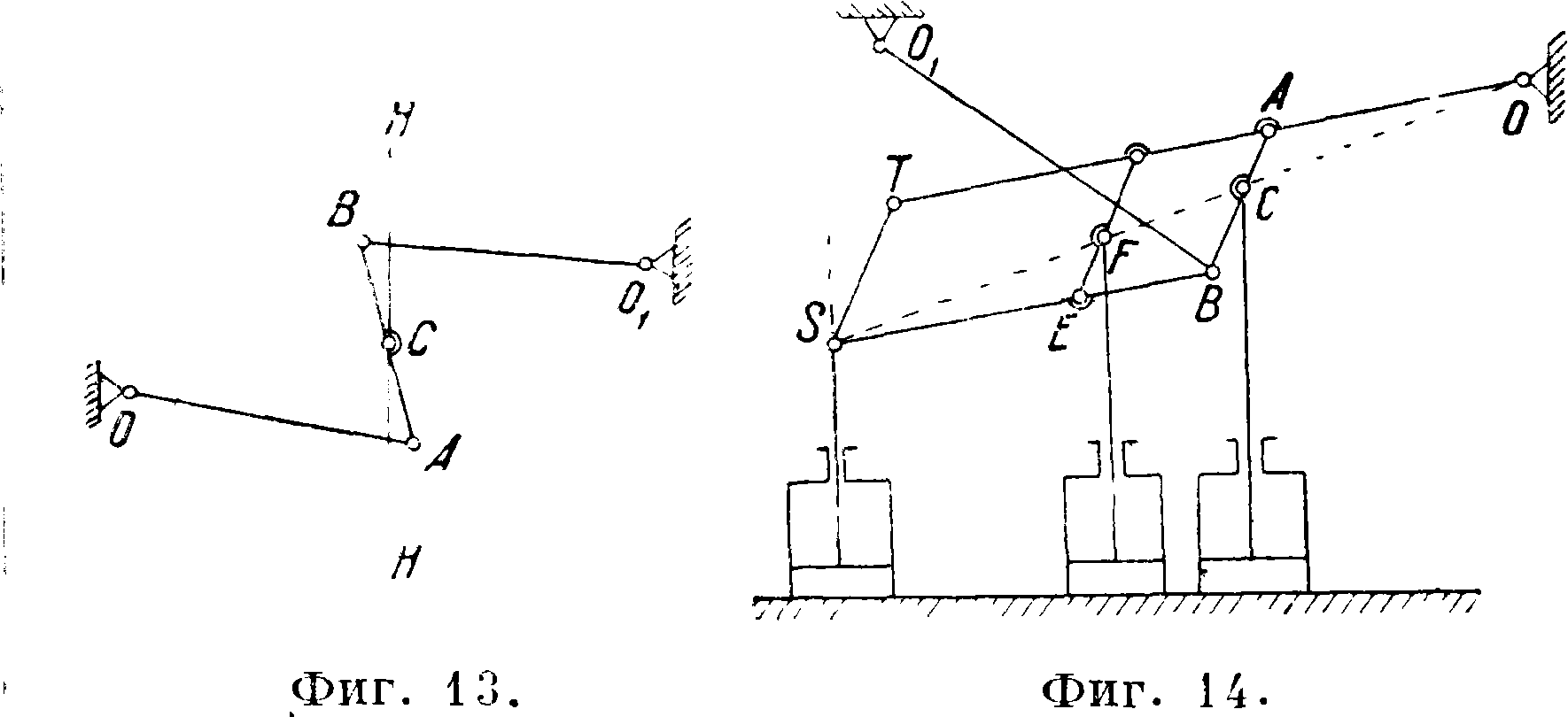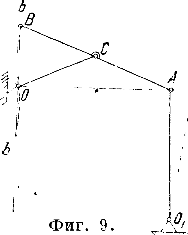 путем замены поступательн. пары парой вращательной в точке Ох и звеном ОгА, имеющим значительную длину. В этом механизме незначительные перемещения точки i от влево дают значительные перемещения точки В по траекториям, весьма близким к прямой. Этот механизм находит себе применение в различных самопишущих приборах. Ведущая точка С звена АВ Ш. н. м. сист. Эванса м. б. выбрана и не по середине звена АВ, а ближе к точке В (фигура 10), или же, как это показано на фигуре 11 и фигура 12, за точками А и В.
