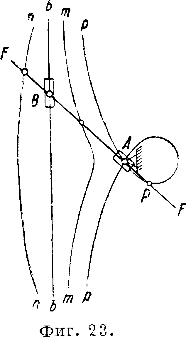 Необходимо отметить нек-рые направляющие механизмы, в которые кроме шарниров входят и пары поступательные. К числу этих механизмов относится группа конхоидальных направляющих механизмов (фигура 20, 21 и 22). Эти механизмы имеют прямолинейно движущимися точки В и основаны на том, что если звено FF (фигура 23) движется так, что проходит через неизменный центр A, a его точка В движется по некоторой прямой bb, то отдельные точки прямой FF описывают кривые тт, пп., рр, называемые конхоидами, имеющие различные очертания в зависимости от выбора точки на звене АВ. Если, обратно, заставить прямую FF проходить через точку А, а какую-либо точку, например Р, двигать по конхоиде рр, то точка В будет двигаться по прямой. Участки конхоид м". б. без больших погрешностей заменены дугами окружностей, тогда получаем ряд различных схем механизмов (фигура 20, 21, 22). Впервые эти механизмы были построены Рей-хенбахом. К числу направляющих механизмов, с введением одной высшей пары, относится механизм Картрайта (фигура 24). Здесь прямолинейное движение точки С осуществляется введением двух зубчатых секторов. В этом механизме 01/1=02В, АС=ВС и оба сектора равны между собой.