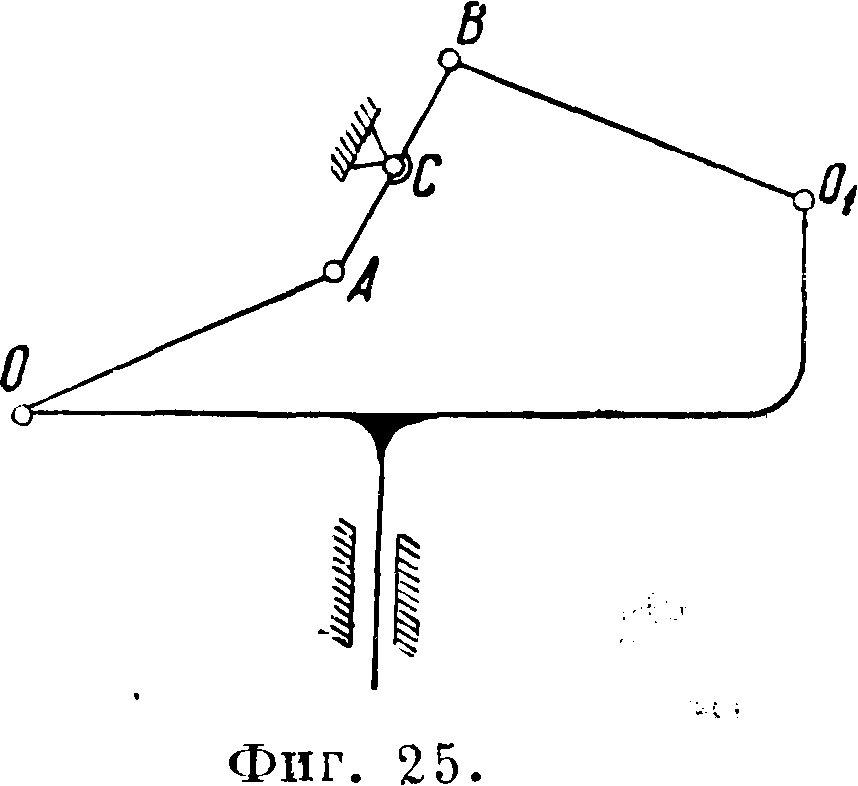 какая-либо точка движется прямолинейно-поступательно относительно неподвижного звена, то "можно, закрепив эту точку, получить прямолинейно-поступательное движение звена, ранее бывшего неподвижным. Таким образом были получены обратные Ш. н. м. систем Эванса, Картрайта, Чебышева и др. На фигуре 25 дан обратный механизм Уатта, а на фигуре 26 обратный механизм Чебышева.