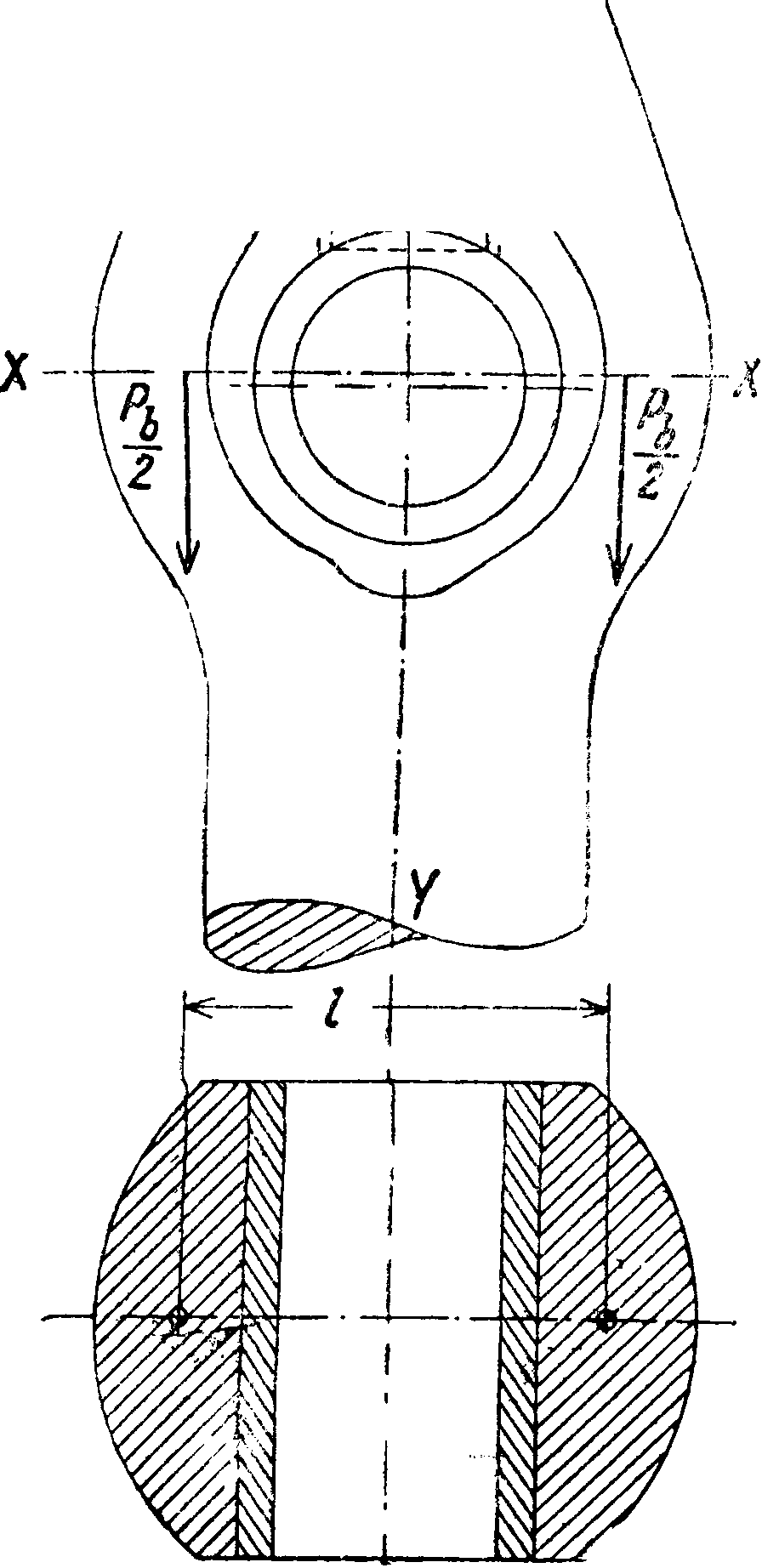жения σζ=, где Fx—площадь сечения бокови ны; напряжение допускается для углеродистой стали до 900 килограмм/см2, а для хромоникелевой до 1 750 килограмм см2. Сечение 1—Y проверяется на изгиб от момента Мь=^ · I. В вильчатых Ш. каждый подшипник нагружен силон ~, действующей