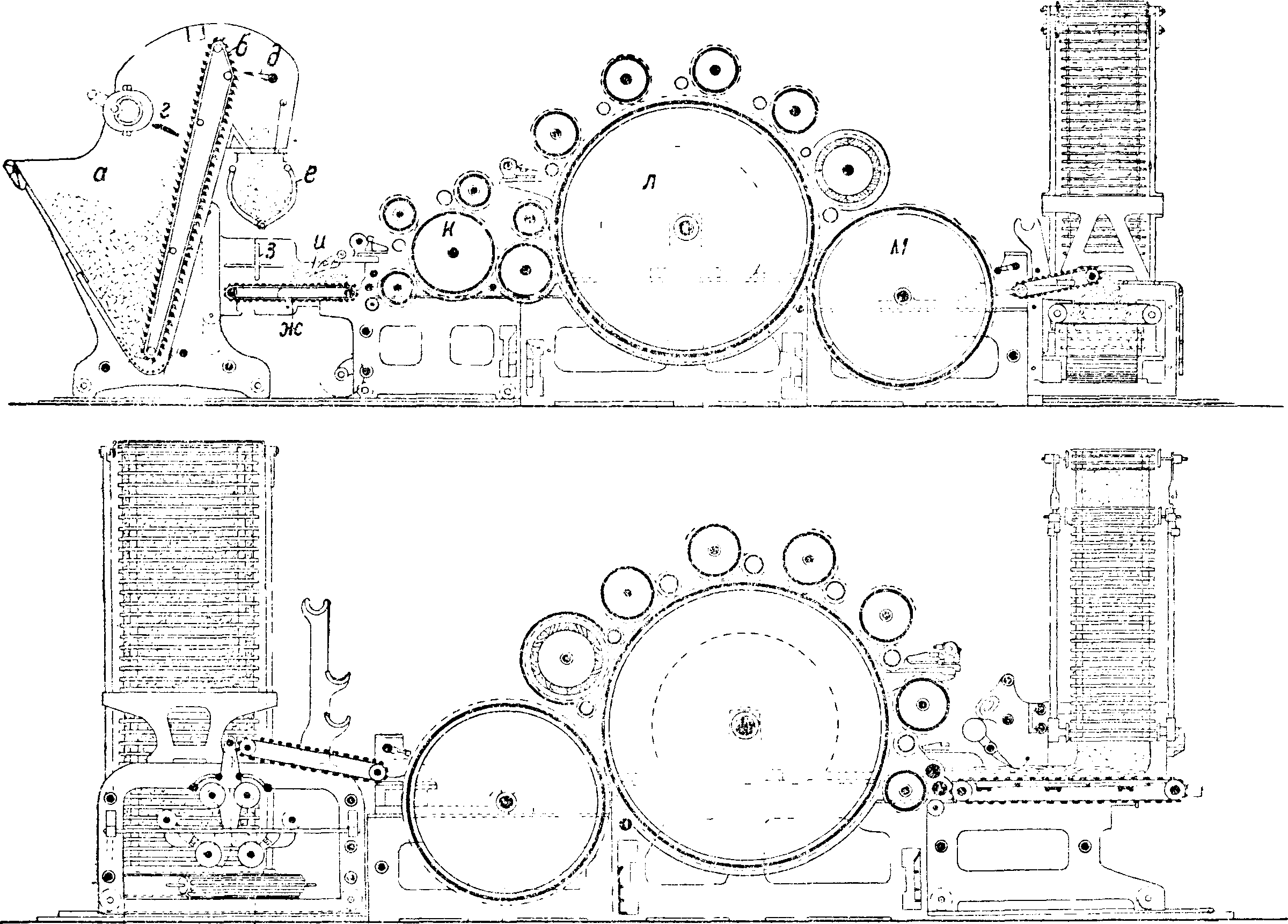 минеральные примеси проваливаются сквозь колосниковую решетку. Одновременно здесь же происходит распрямление и очистка шерсти. Колосниковая решетка состоит из двух половин, посаженных на оси д, которые могут по мере необходимости откидываться. При чистке машины они опускаются вниз. Колосниковая решетка (и правая и левая половины) состоит из железных прутьев, между которыми имеются зазоры 3—5 миллиметров. После нижней колосниковой решетки шерсть колками барабана подводится к верхней колосниковой решетке, ударяется о нее, в результате чего получается вторичное встряхивание шерсти. Пыль_через отвер