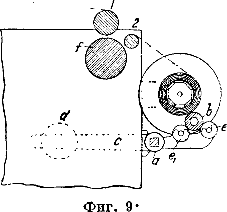 Кроме приспособления, служащего для поддержания постоянной скорости движения основы, имеется еще прибор для правильной намотки ее на ткацкий навой в отношении степени плотности навивания. Он состоит (фигура 9) из вала а, на к-ром на каждой стороне навоя сидит по подшипнику с двумя каточками е и еъ а на них опирается скалка b. На валу а закрепляется еще рычаг с с грузом d. Передвижением груза d, к-рый прижимает скалку b, изменяют плотность навивки; /—мерильный валик, 1л2—вспомогательные валики. Движение шлихтовальной машины должен быть устроено т. о., чтобы можно было устанавливать требующуюся
