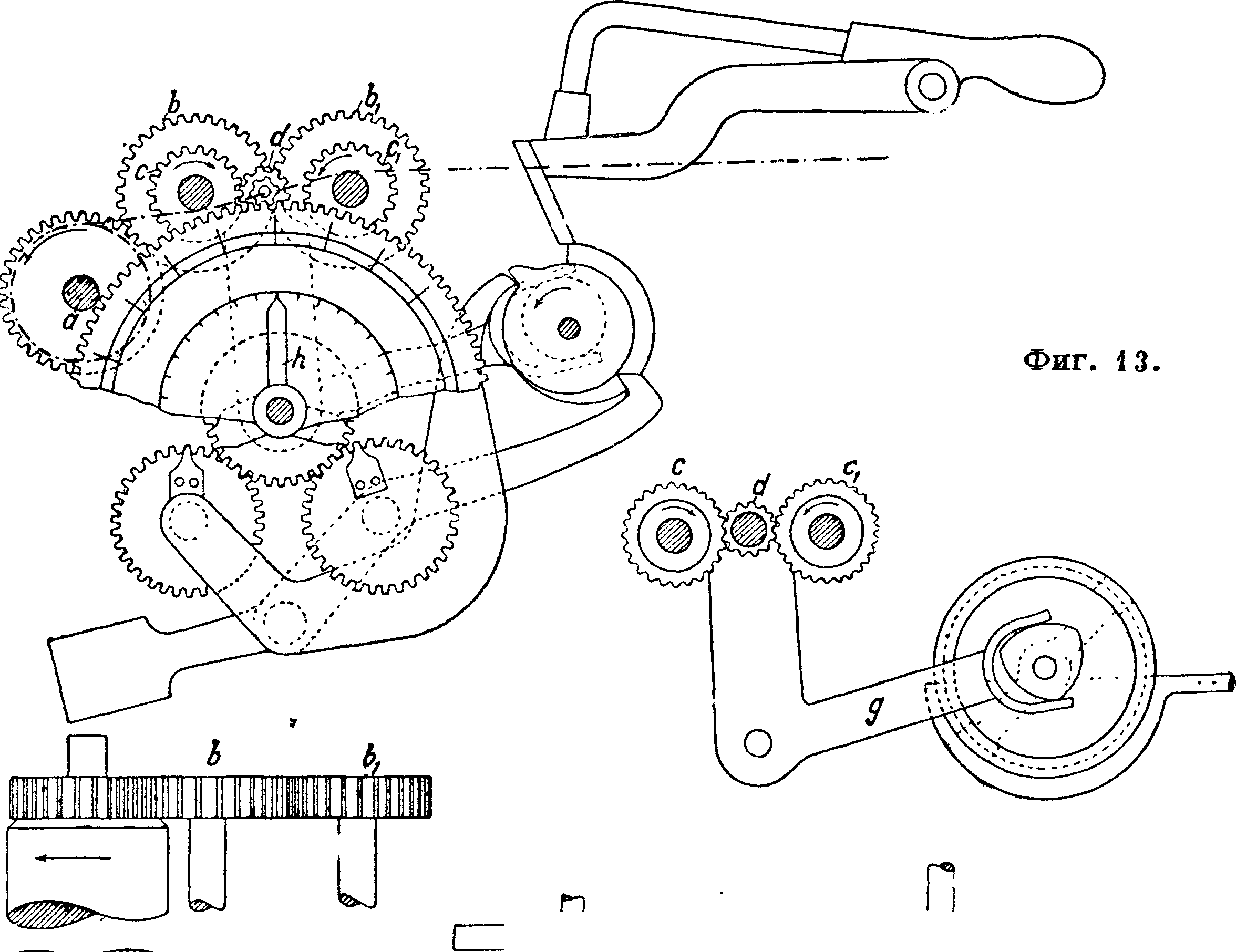 На фигуре 13 изображен т. н. диференциальный счетчик системы Гитчона. На мерильном валике а имеется шестерня в 36 зубьев, передающая вращение шестерням b и bг по 35