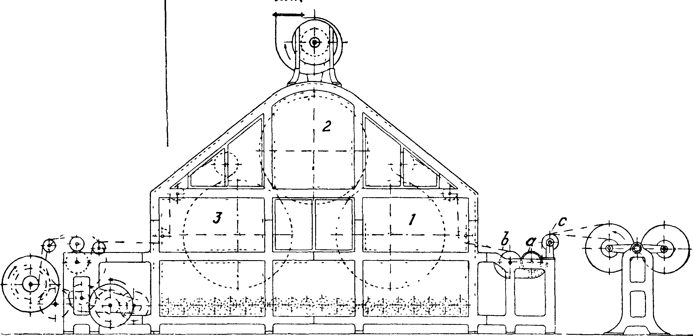 Другой тип· шлихтовальных машин—с камерной сушкой—отличается от барабанных в большинстве случаев только устройством сушильного аппарата; остальные части в обоих случаях почти одни и те же и по своему назначению и по устройству. Разница в действии сушильного аппарата следующая. При барабанной системе нити, непосредственно соприкасаясь с горячими поверхностями, высушиваются скорее, и производительность поэтому больше; но при этом проникновение