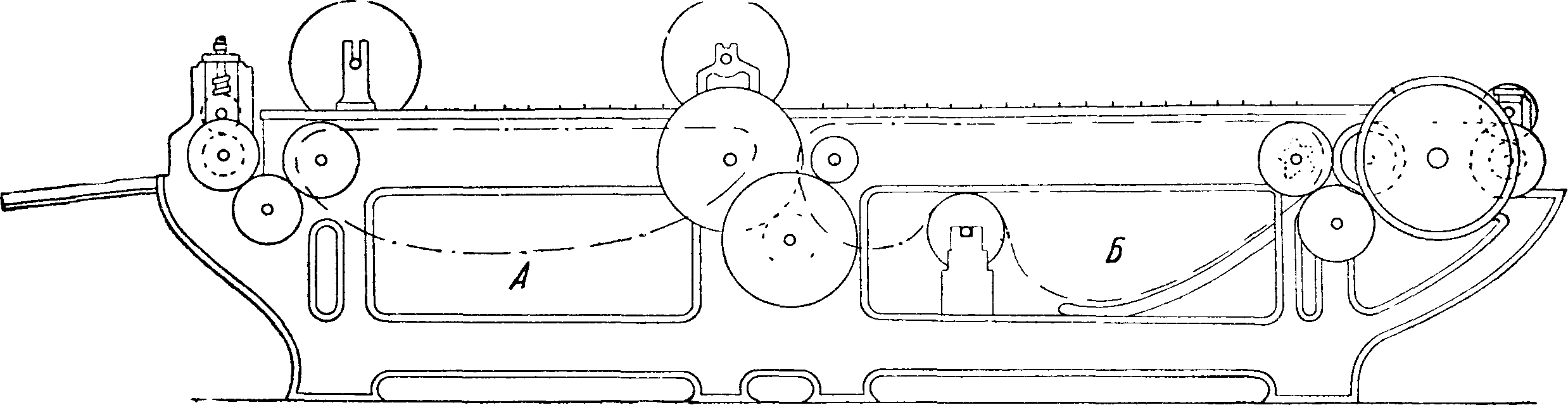 Фабричная обработка сизальской пеньки в сноповязальный Ш. производится на специальных машинах, причем процесс прядения ее, как и при прядении европ. лубяных волокон, разбивается на две основные части: а) подготовление пеньки к прядению (подготовительный процесс), б) прядение. Подготовительный процесс проводится на специальном наборе (системе) машин, состоящем из двух или трех (в зависимости от качества сизальской пеньки) горизонтально-чесальных машин сист. Гуда (фигура 1) и трех ленточных машин. Машина Гуда состоит из двух гребенных полей А и Б, расположенных одно позади другого и работающих при различных скоростях, в результате чего волокна, проходящие с первого на второе гребенное поле,