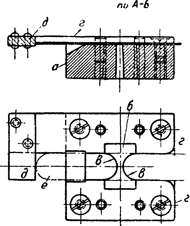 работы пунсон направляют при помощи особой направляющей планки; такие Ш. называются закрытыми. Закрытый Ш. изображен на фигуре 5. Пунсон а проходит через точно пригнанный по нему прорез направляющей планки б, чем обусловливается точное направление пунсона; одновременно направляющая планка служит съемником для надевающегося после вырубки на пунсон материала. Пунсон укрепляется либо непосредственно в верхнике в либо к последнему прикрепляется винтами особая снабженная вырезами пластина г, называемая крышкой, которая и удерживает на месте пунсон или пунсоны. При пунсонах малых размеров для предотвращения вдавливания их в сравнительно мягкий материал верхника между последним и пунсонами ставят стальную прокладку д толщиной 5—8 миллиметров.