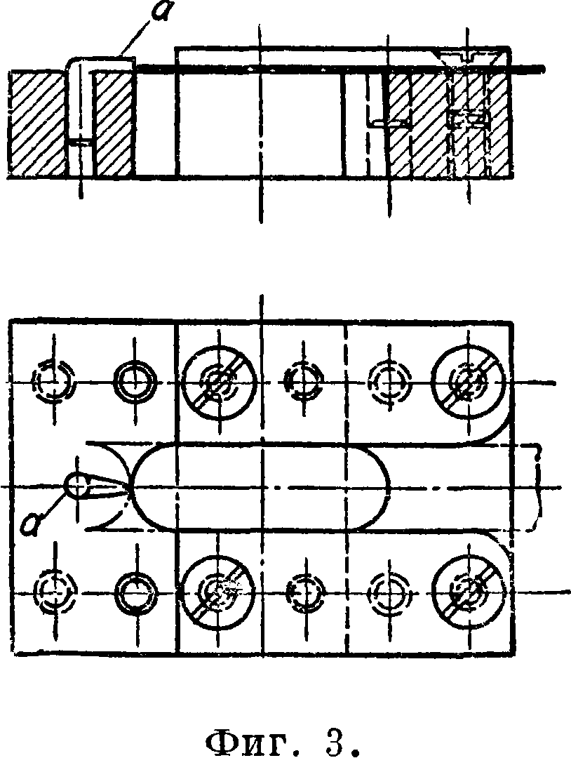 Двухконечный III. применяется в том случае, когда желательно из полосового материала получить детали с прямыми или фасонными концами. Двухконечный III. для вырубки звеньев с полукруглыми концами изображен на фигуре 2. Матрица а имеет в середине вырез б для прохода пунсона, к-рый снабжен 2 полукруглыми режущими кромками в. Материал подается между двумя направляющими планками г до упора д и в этом положении А перерезается пунсоном, имеющим то же сечение, что и вырез б; вырезанная Фиг· 2·