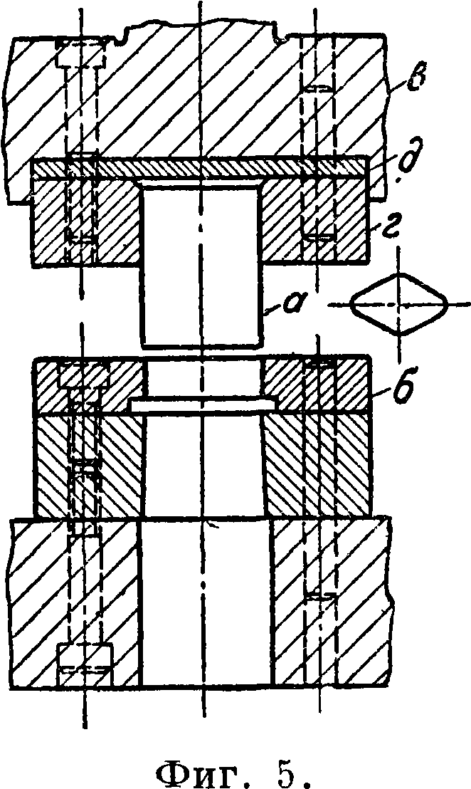он м. б. равным образом сконструирован как Ш. последовательного действия. G целью уменьшения отходов упор а должен лежать возможно близко к задней режущей кромке матрицы. Наиболее простым типом вырубного III. является открытый круглый вырубной Ш., изображенный на фигуре 4. Ш. состоит из верхника а, пунсона б, нижника в и матрицы г. Материал кладется на матрицу, и деталь вырубается пунсоном при его опускании; вырубленная деталь проваливается через отверстие в матрице и нижнике, таким образом на этом Ш. с каждым ходом пунсона получается одна готовая деталь. Недостатком открытых Ш. является то обстоятельство, что неизбежная игра в направляющих пресса сильно отзывается на точности его работы. Поэтому для точной