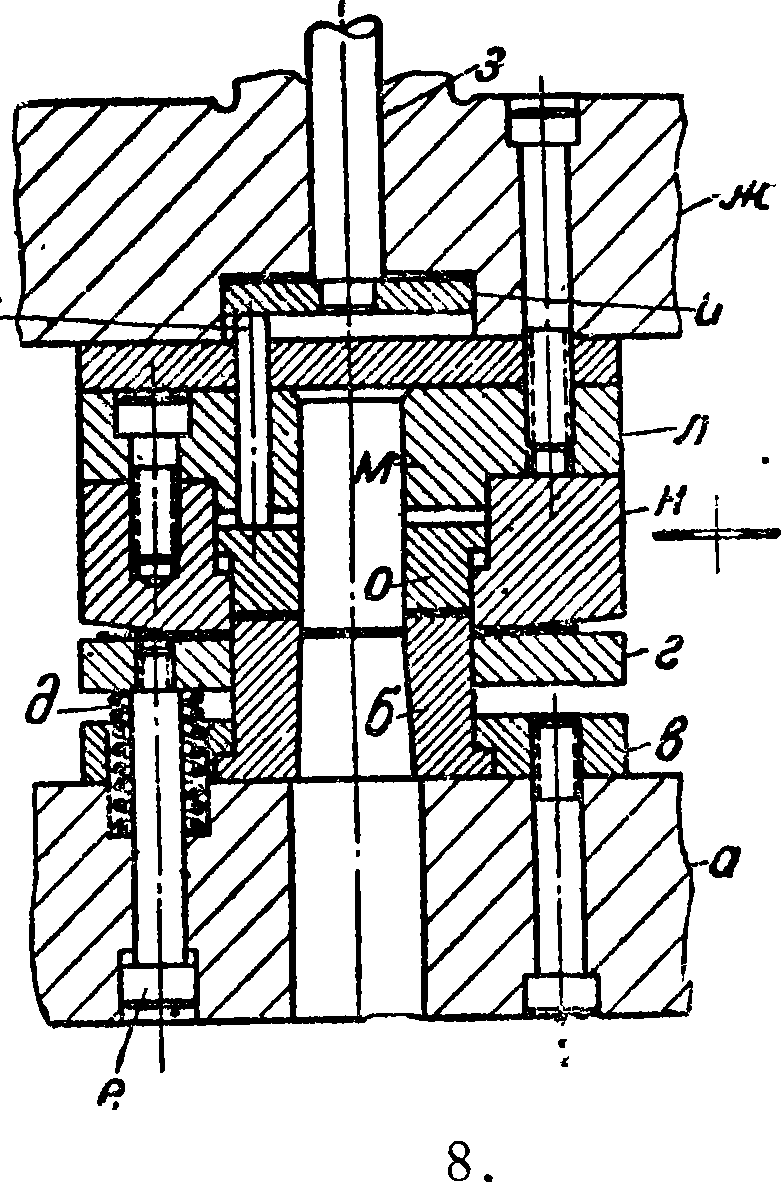 Открытый комби н и р о в а н н ы и вырубной Ш. изображен на фигуре 8. Ш. фиг. состоит из нижника а, на к-ром матрица б укреплена посредством нажимного кольца з; снаружи матрицу охватывает съемник г, который одновременно является платформой для подводимого материала. Подъем съемника после штамповки осуществляется тремя или более пружинами б, высота же подъема ограничивается винтами е. Верхняя половина Щ. состоит из верхника ж, через к-рый проходит стержень з выбрасывателя, оканчивающийся плитой и нажимающий на стержни к. К верхнику на винтах прикреплена