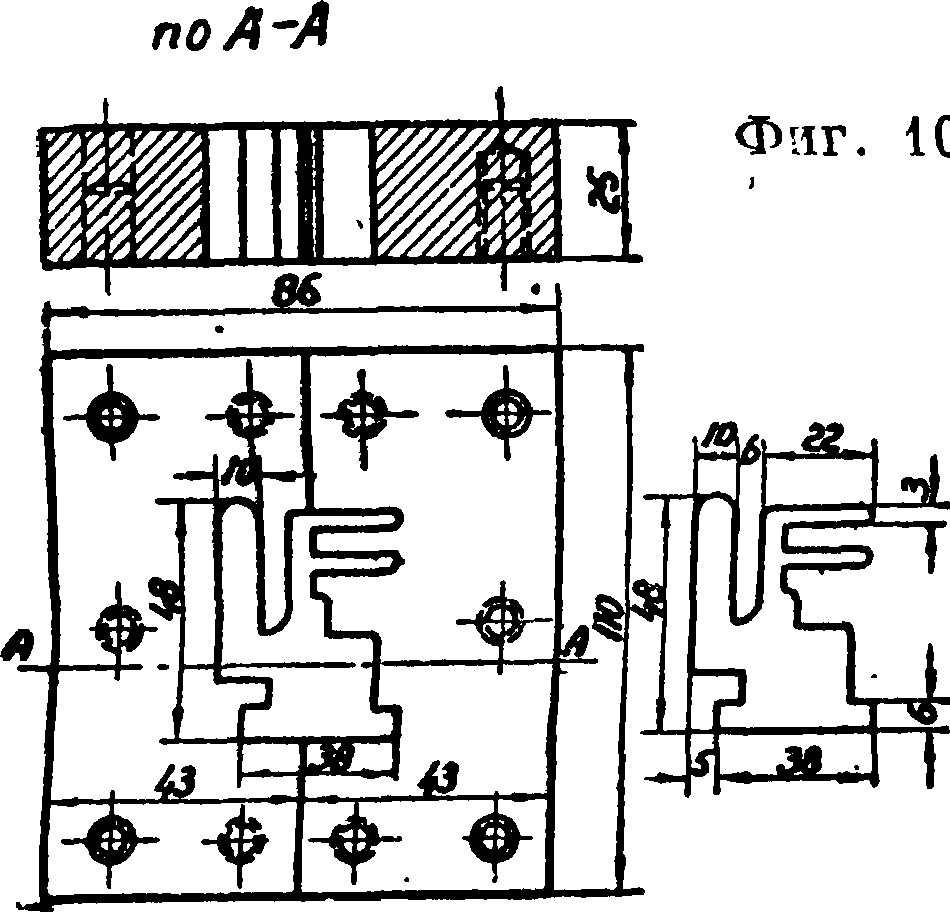 Многократные Ш. применяются с выгодой при штамповке из полосы мелких несложных изделий. Изображенный на фигуре 6 Ш. состоит из верхника а, крышки б, ряда пунсонов в, прокладки г, ниж-М ника б, направляющей планки е и матрицы ж. Между матрицей ж и направляющей планкой е помещается рамка з, служащая для придания материалу правильного положения в Ш. Пунсоны располагаются т. о., что они вырубают одновременно несколько деталей, расположенных в разных рядах уступами (заштрихованные участки на фигуре 6, А) с тем, чтобы после продвижения полосы на один шаг вырубки возможно плотно занимали всю поверхность материала. В многократных Ш. выгодно для уменьшения максимального усилия штамповки располагать режущие кромки пунсонов не на одной высоте, а, как показано на фигуре 6, уступами, причем величина уступа делается равной или немного меньше толщины материала. Для уменьшения опасности перекоса Ш. полезно делать пунсоны попарно одинаковой высоты и располагать эти парные пунсоны т. о., чтобы ц. т. контуров режущих кромок приходился для каждой пары приблизительно в одной точке в центре Ш. При штамповке более сложных деталей, требующих последовательного применения нескольких Щ., можно их объединить в один сложный т. н. III. последовательного действия; т. о. сберегается время, уменьшаются затрата мощности и расход на инструмент. На фигуре 7 изображен простой Ш. последовательного действия для вырубки шайб. Дыропробивной пунсон а пробивает отверстие шайбы, после чего материал продвигают под главный пунсон б; ловитель з, попадая в предварительно вырубленное отверстие, устанавли