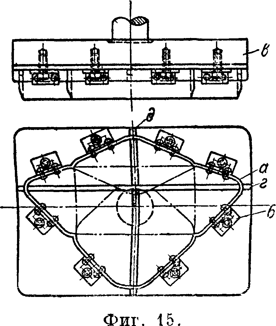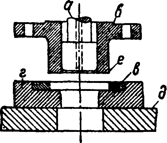 Вырубка днищ всевозможных предварительно вытянутых изделий м. б. произведена на Ш., аналогичном изображенному на фигуре 12. Пунсон а укрепляется в плите нижника б. На пунсоне может перемещаться центровочное кольцо в, к-ро.е является одновременно выталкивателем готового изделия, поднимаясь под действием пружин г вырубное кольцо д в Ш. малого размера является одновременно верхником; в более крупных Ш. однако их изготовляют из отдельных частей.