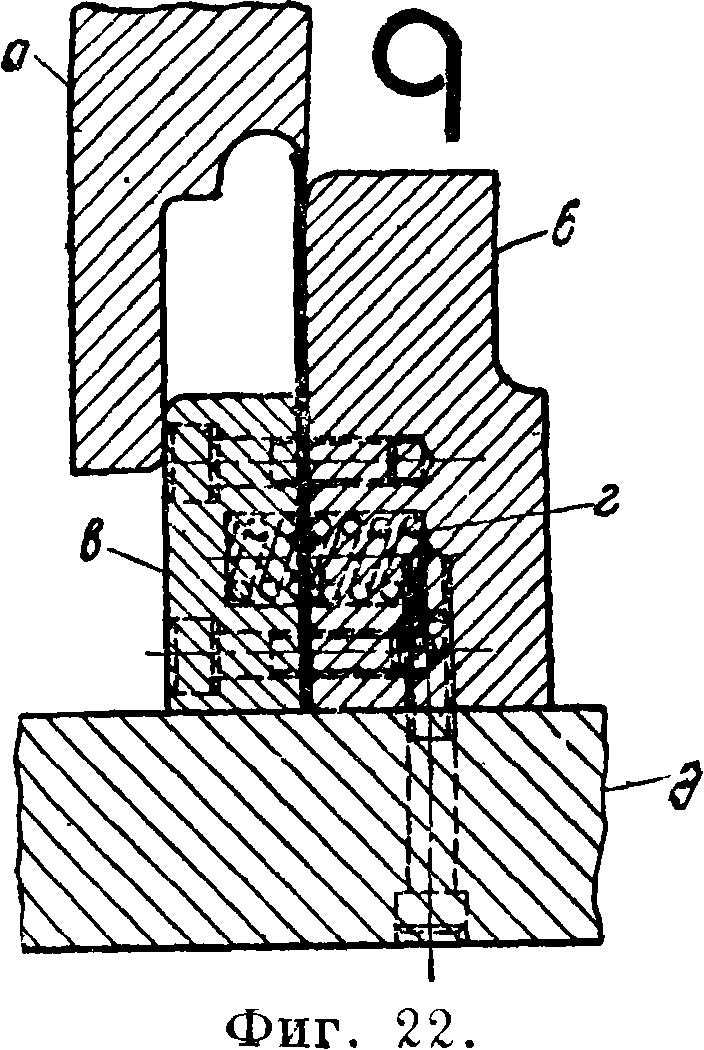 На фигуре 21 изображен многократный гибочный Ш., служащий для производства за один раз нескольких загибов одной детали. Ш. состоит из пунсонов а и б, пружины в, прижимающей внутренний пунсон, нижника г и выбрасывателя д. Заготовку кладут между упорами е на матрицу; идущий вниз пунсон б изгибает сначала заготовку в виде буквы U. Как скоро пунсон достигнет дна углубления матрицы, пружина в начинает сжиматься, и наружный пунсон а отгибает внешние края изделия под прямым углом, прижимая их к матрице. При подъеме пунсонов приходит в действие выбрасыватель, который выталкивает готовое изделие из матрицы. Пружина в должна быть сделана достаточно сильной для того, чтобы внутренний пунсон мог совершить первый U-образ-ный загиб.