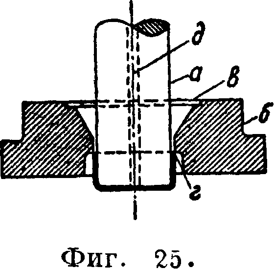 Простой вытяжной Ш. без придерж-ника, изображенный на фигуре 25, представляет собой простейший тип вытяжного Ш.; он состоит из вытяжного штемпеля а и кольца б, снабженного выточкой <?, служащей гнездом для предварительно вырубленной заготовки. Верхняя часть отверстия вытяжного кольца сделана на конус с углом при вершине 60°. Прилегающая к конической короткая цилиндрич. часть снабжена внизу выточкой г, острая кромка которой служит сбрасывателем при движении штемпеля кверху. Пэследний снабжен в середине отверстием д для прохода воздуха. Простой вытяжной Ш. с придержником изображен на фигуре 26; он состоит из вытяжного штемпеля а, придерж-ника б, матрицы (кольца) в и резинового буфера г. Преимуществом этого Ш. в сравнении с предыдущим является отсутствие образования складок вследствие наличия придержника. При работе Ш. заготовка вкладывается в углубление матрицы, а затем при опускании ползуна пресса при-держник прижимает при посредстве резинового буфера заготовку к матрице, после чего вытяжной штемпель протягивает заготовку через отверстие последней. В течение этого времени резиновый буфер сжимается все больше, и т. о. при-держник оказывает на обрабатываемую деталь непрерывно возрастающее давление. При следующем затем движении штемпеля наверх изделие снимается острым кантом д выточки матрицы.