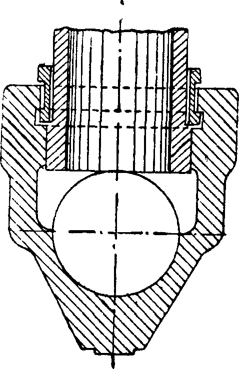 При давлении до 20 atm кон- фИг. 2. цы труб, обточенные на конус, гидравлически или с помощью подтяжки болтов вручную впрессовывают в верхние и нижние коробки. При давлениях 20—35 atm применяют или способ соединения труб с коробками при помощи винтовых нарезов (фигура 2) или при помощи особой кольцевой чеки—по методу завода Dusseldorf-Heerdt (фигура 3). Дополнительное укрепление труб в коробках производят также путем заполнения канавок, выточенных в местах конуса коробок и труб, расплавленным белым чугуном. Заполнение чугуном этих канавок, расположенных друг против друга, производится через высверленные снаружи отверстия. Эти отверстия затем заделывают при помощи пробок с Фигура з. нарезкою. Число труб в одной коробке (секции) 4—6—8—10— 12. Каждая коробка с помощью фланцев d на болтах вверху присоединяется к коллектору е (фигура 1), а внизу к коллектору с. В верхнем и нижнем коллекторах против каждой секции имеется по лючку д. Секций в одном элементе делают 4—8—12—16, устанавливая между нижними коллекторами лирообразные компенсаторы а (фигура 4). Э., работающие при давлении свыше 20 atm, имеют специальные анкерные трубы, стягивающие верхние и нижние коллекторы. Трубы располагаются или рядами или в шном порядке, причем в Э. газы двигаются как в направлении перпендикулярном, так и в направлении, параллельном ^трубам. Стандарты поверхностей нагрева одной трубы для Э, изготовленных в СССР, таковы: 1,0 ж2, 1,25 м2, 1,40 м2 и 1,5 м2.
