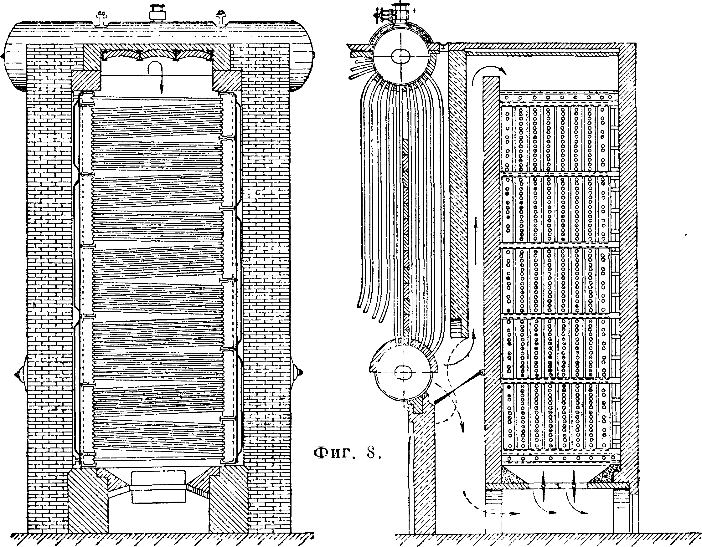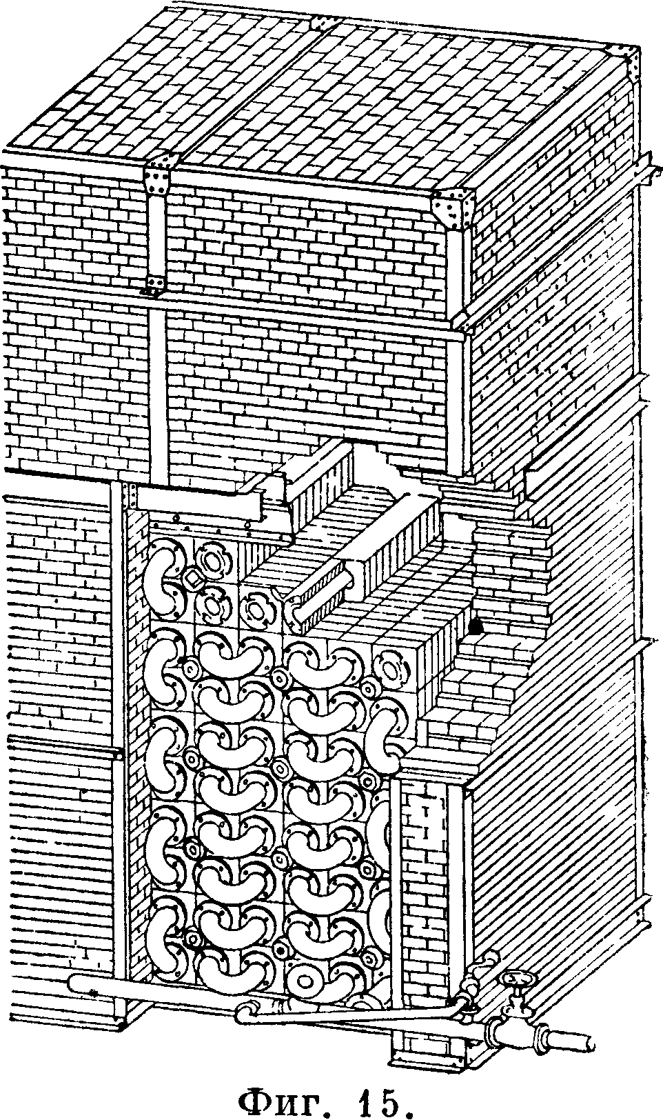 водяных Э. должна соответствовать следующим требованиям: а) каркас Э. должен быть рассчитан на восприятие кроме-нагрузок от действия веса металлич. частей Э.-и находящейся в трубах и коллекторах воды, также и нагрузок от расширения кладки; б) кирпичная кладка должен быть плотной, для чего необходимо выполнять ее толщиной не менее 1,5 кирпича, при железо-асбестовой или подобной обмуровке стыки отдельных щитов не должны пропускать воздух внутрь обмуровки; то же требование должен быть предъявлено как к стенкам, образуемым ребрами и коллекторами Э., так и к гарнитуре Э.;