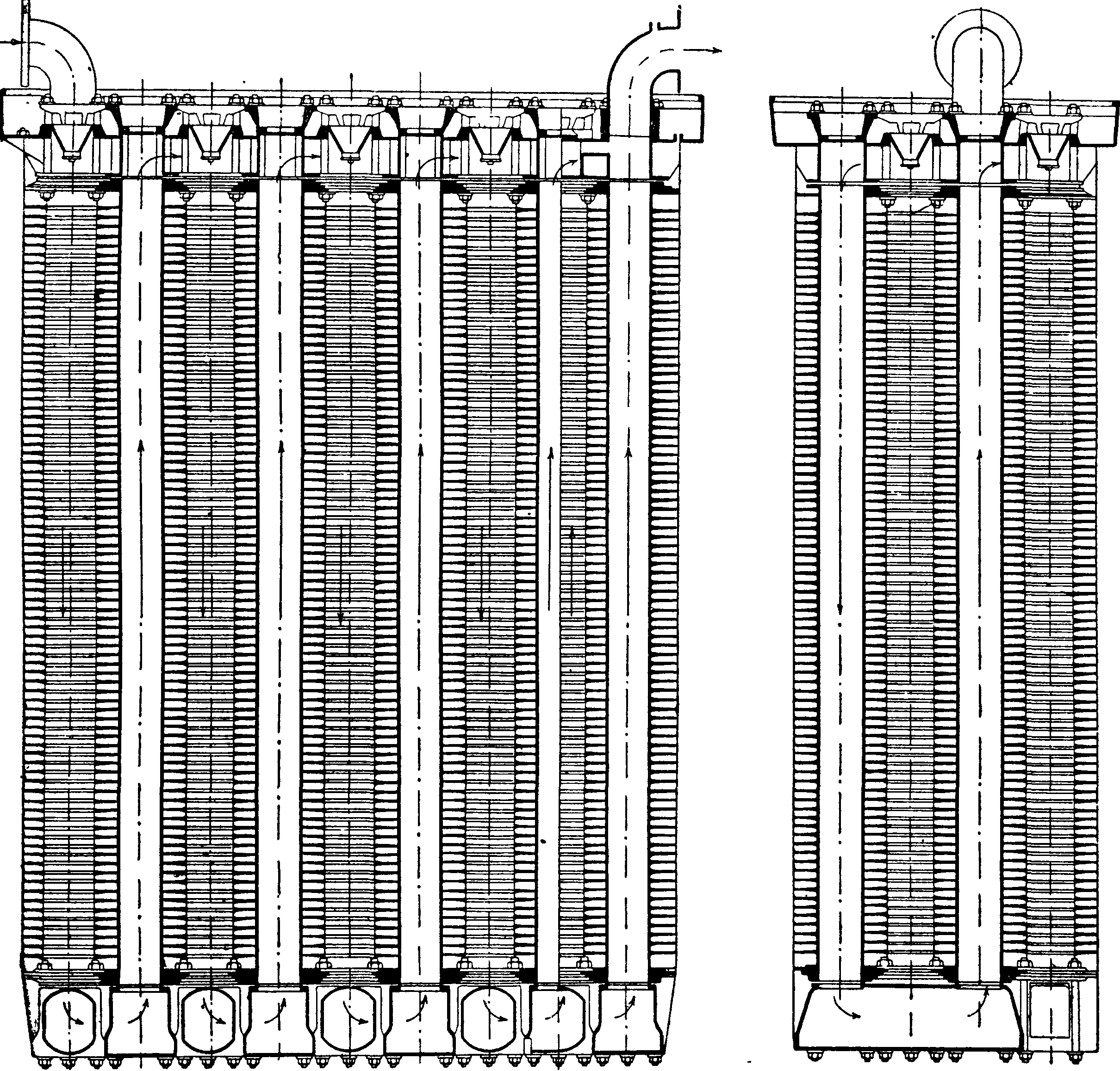 Железный Э. Ленинградскогоме-таллического завода им. т. Стали-н а (фигура 8) состоит из секций, расположенных одна над другой в несколько рядов (на эскизе 5 рядов), причем первая и последняя секции имеют высоту вдвое меньше, чем все остальные. Все трубы вальцуются с наклоном по ходу потока воды снизу вверх.