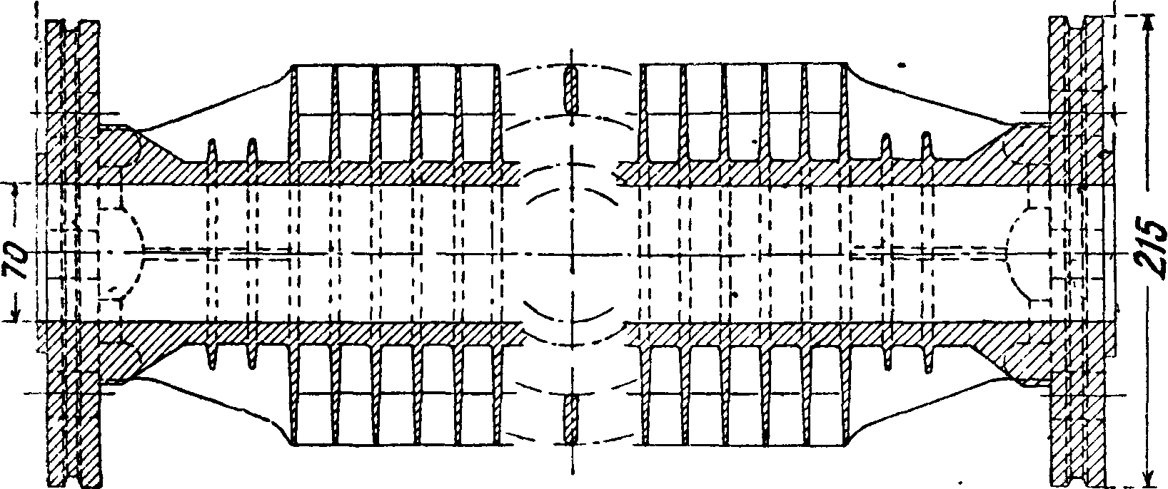 не нарушая всей системы Э. Чугунные Э., указанные на фигуре 17; з-ды Главэнергопрома выполняют до рабочего давления в 65 atm, при больших же давлениях они собирают трубы по модели 1932 г., изображенной на фигуре 22. Он состоит из цельнотянутых труб 1, на которые надеты в горячем состоянии (в дальнейшем предположена контактная сварка) ребристые восьмиугольные кольца 2 и установочные кольца по краям труб 3—4. Трубы ввальцовываются во фланцевые крышки по 4, 5, 6, 7, 8 и 9. Длина каждой трубы4 метров вместо 2 метров в случае чугунных ребристых труб, что имеет большое значение в смысле уменьшения габаритных размеров по сравнению с чугунными трубами.