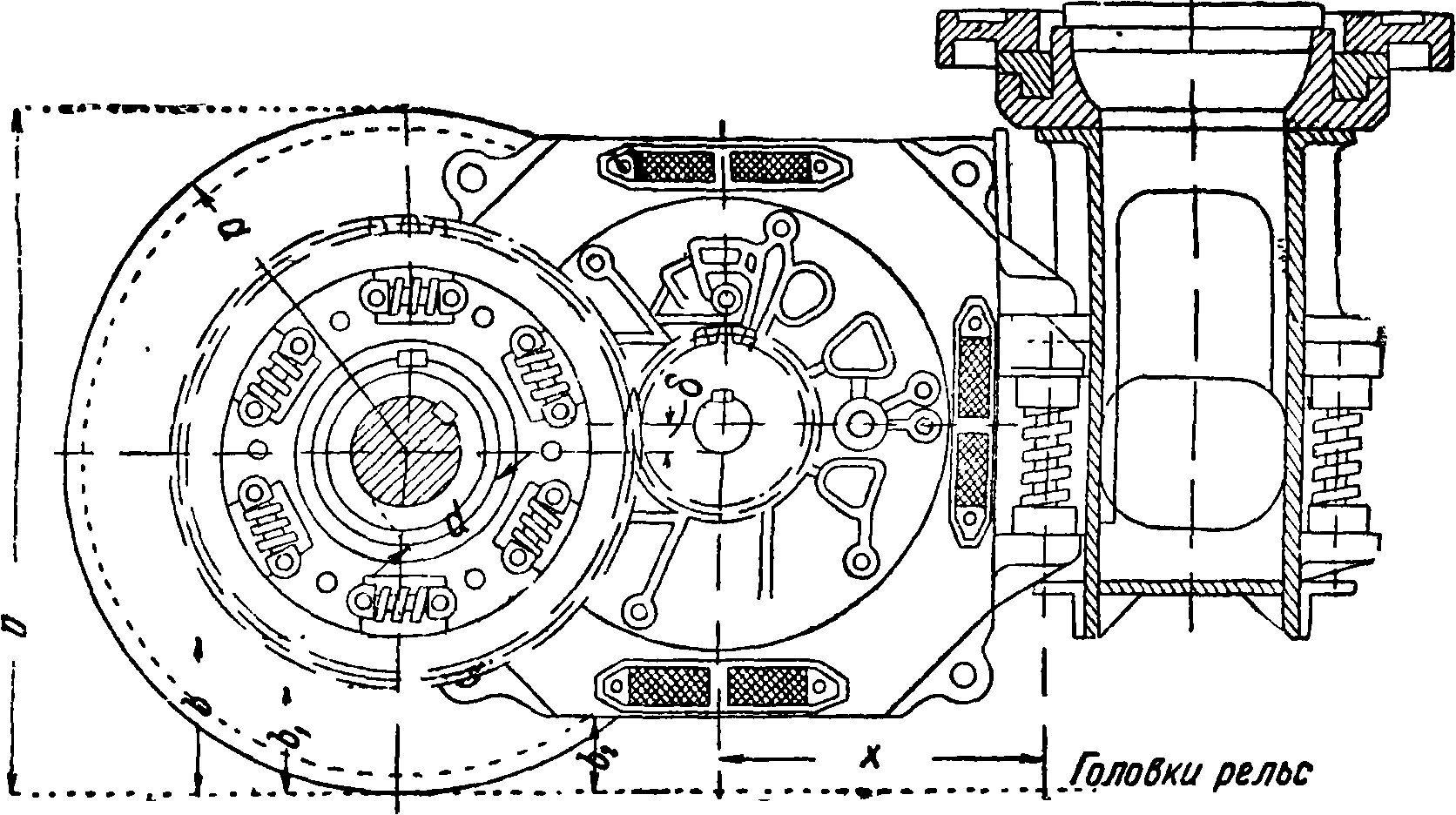 Конструкция и габарит Э. т. определяются принятой системой передачи крутящего момента и подвески Э. т. Выбор этой системы р.ешает вопрос о количестве Э. т. и наличии редуктора. Тем самым определяется мощность и степень быстроходности Э. т. Вопрос о концентрации мощности в одном-двух или многих Э. т. зависит от характеристики Э. т. При Э. т. с сериес-характеристикой в современной технике ясно намечается тенденция к применению индивидуального привода, когда каждая ось приводится от одного-двух Э. т. При этом получаются легкие быстроходные Э. т. Удешевляются производство и эксплуатя. Удешевляется оборудование депо [11]. Дробление мощности облегчает применение редукторов, входящих в большинство систем индивидуального привода. При Э. т. с шунтовой характеристикой плохое распределение нагрузок заставляет концентрировать мощность в немногих Э. т., приводящих в движение группу осей. Концентрация мощности приводит часто к отказу от включения редукторов, Из большого разнообразия систем индивидуального привода отметим следующие: 1) Трамвайный привод. Э. т. с помощью разъемного «моторно-осевого» подшипника опирается на скат и другой стороной через пружины на раму (фигура 7). Шестерня на валу двигателя сцеплена с зубчаткой, сидящей на оси ската. Максимальный размер зубчатки и передаточное число ограничиваются нормированным расстоянием от низшей точки кожуха передачи до головки рельса bг. Этот размер при неизношенных бандажах должен быть не меньше 120 миллиметров по габариту НКПС-2В и 100 миллиметров для трамваев (у амер. трамваев bг доходит до 70 миллиметров). Централь а связана с диам. ротора Daэмпирич. соотношением: