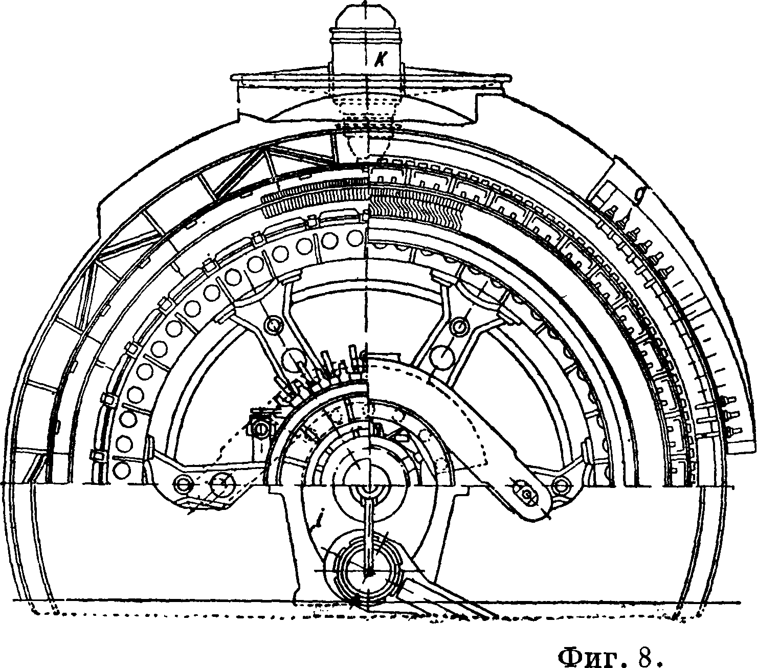 форматор. Мотор электровоза Кандо [34, 38, 37] 50 Hz выполнен с двумя обмотками в роторе, присоединенными к 16 кольцам (фигура 8). Питание подводится к ротору. Статор имеет 48 отводов, постоянно приключенных к реостату. Переключение колец ротора дает 72 и 36; 24 и 18 полюсов при питании соответственно трех фаз: трехфазно, шестифазно и двухфазно. Мощность двигателя (часовая) соответственно 1000, 2 220, 2 500, 2 500 л. с. Вес мотора 18,5 т, ротора 10 т.