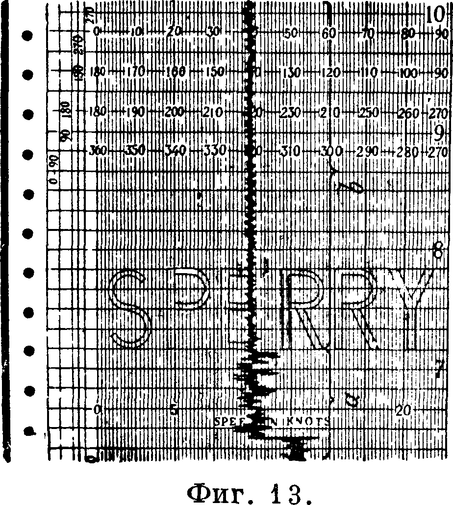 Курсограф Сперр и—прибор для ав-томатич. записи курса корабля в ф-ии времени. Существенной частью этого прибора является моторчик а (фигура 9), электрически связанный с гирокомпасом и приводящий в движение диск б и барабан в; первый обточен по окружности по четвертям различными радиусами и совершает один оборот за один оборот картушки компаса, авто-рой имеет двойную винтовую канавку и совершает два оборота за один оборот картушки. На окружность диска б опирается ролик одного пера г, отмечающего ту четверть компасной розы, в которой лежит отмечаемый курс. В прорез барабана’ в входит палец каретки d, несущей второе перо е, отмечающее курс, указываемый компасом. Бумажная лента ж, перемещаемая часовым механизмом, имеет соответствующую разбивку; на ленте также отмечено время в часах и десятках минут. Прибор допускает беспрерывную работу в течение 30 суток. Прибор дает документальную запись курсов корабля за истекшее время, позволяет проверять работу рулевых, оказывает помощь при балансировке и выверке гирокомпаса и гирорулевого; изготовляется для работы со всеми марками гирокомпасов Сперри.