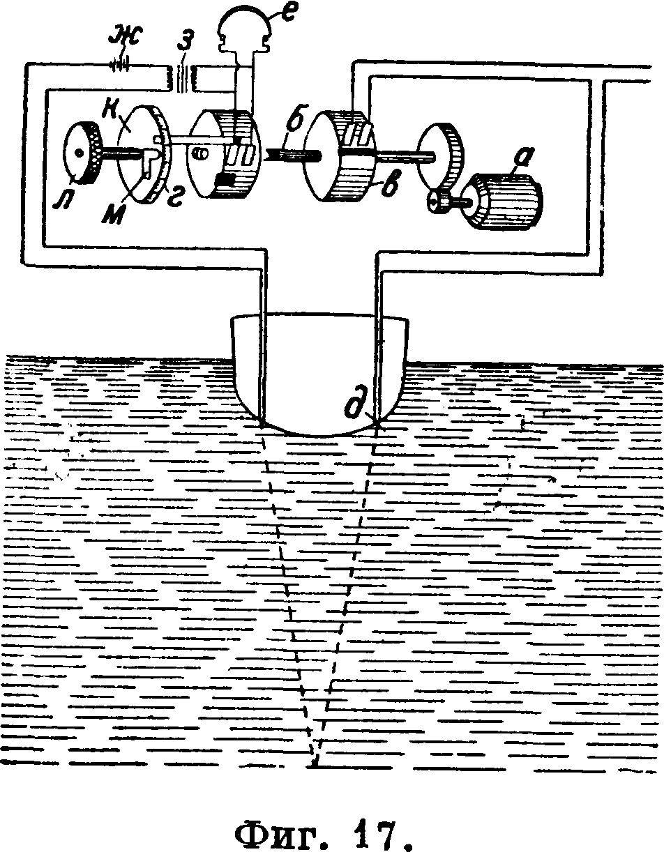 междудонном пространстве корабля, и их мембраны либо непосредственно соприкасаются с зной водой либо, при установке приборов в заполненных водой ящиках (танках), звук передается в воду через обшивку корабля. Трансмиттер и гидрофон устанавливаются с различных бортов корабля так, чтобы корпус корабля являлся экраном для непосредственного прихода звука от трансмиттера к гидрофону. Приемно-отправительная станция в, схематически изображенная л на фигуре 17, заключает в себе небольшой электродвигатель а, работающий с постоянной скоростью, для чего имеется особый центробежный регулятор. Этот двигатель вращает вал б со скоростью 3 об/ск. На валу укреплены два металлических диска-выключателя в и г, на поверхности которых имеются узкие полоски из изолирующего материала. К выключателю в трансмиттера прилегают 2 щетки, через которые подается ток в обмотки электромагнитов трансмиттера ό; при подходе полоски изолятора под щетки трансмиттер подает сигнал. К выключателю г телефона прилегают щетки, замыкающие нормально телефон е накоротко.